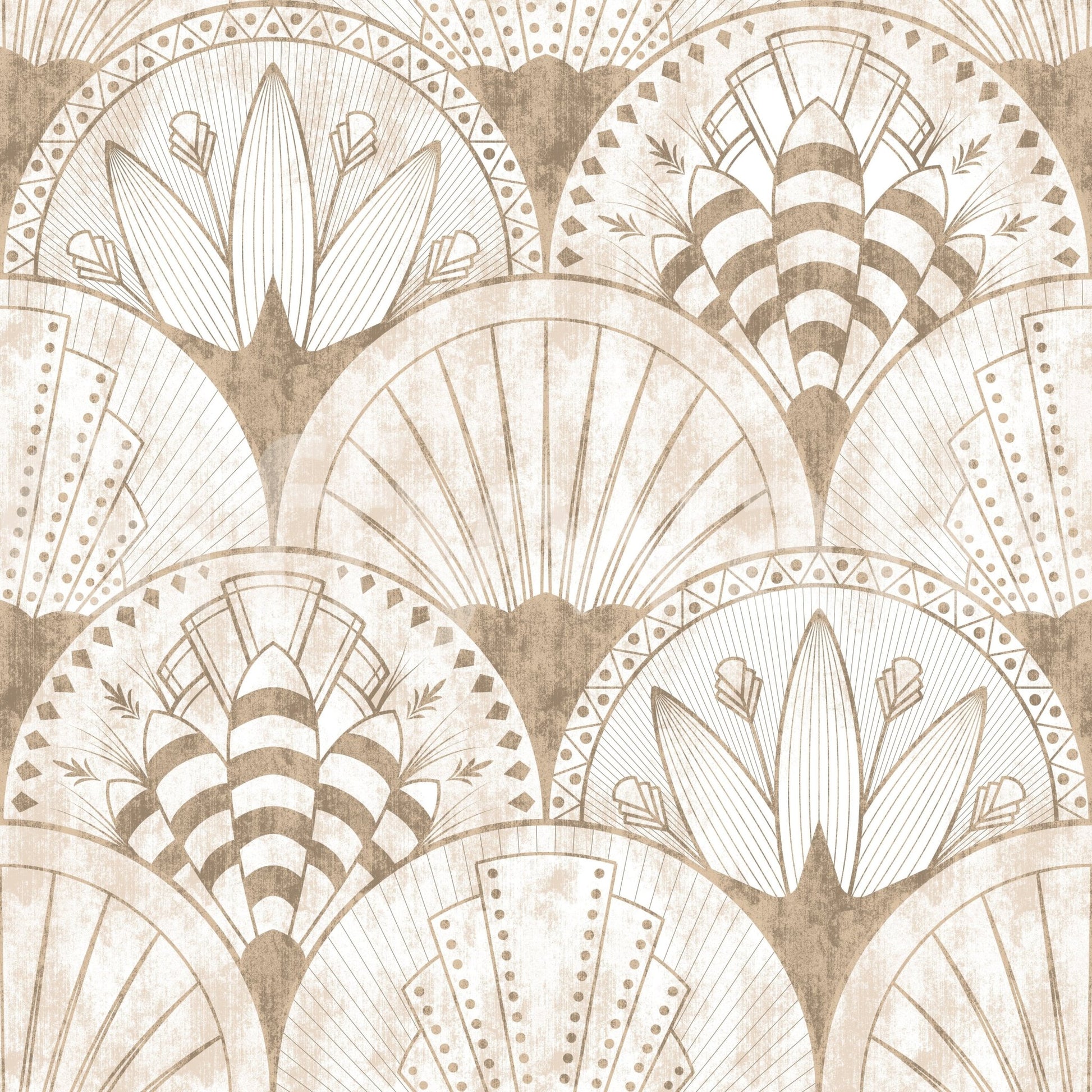 This wallpaper design captures the timeless sophistication of Art Deco style. The intricate geometric patterns, reminiscent of stylized fans and floral motifs, are rendered in elegant beige and off-white hues. A subtle textured background adds depth and visual interest, creating a feeling of luxurious vintage charm. Perfect for adding a touch of classic glamour to any space, from living rooms and dining rooms to bedrooms and hallways. The muted color palette ensures a calming yet stylish atmosphere, making it versatile enough to complement a variety of interior design styles.