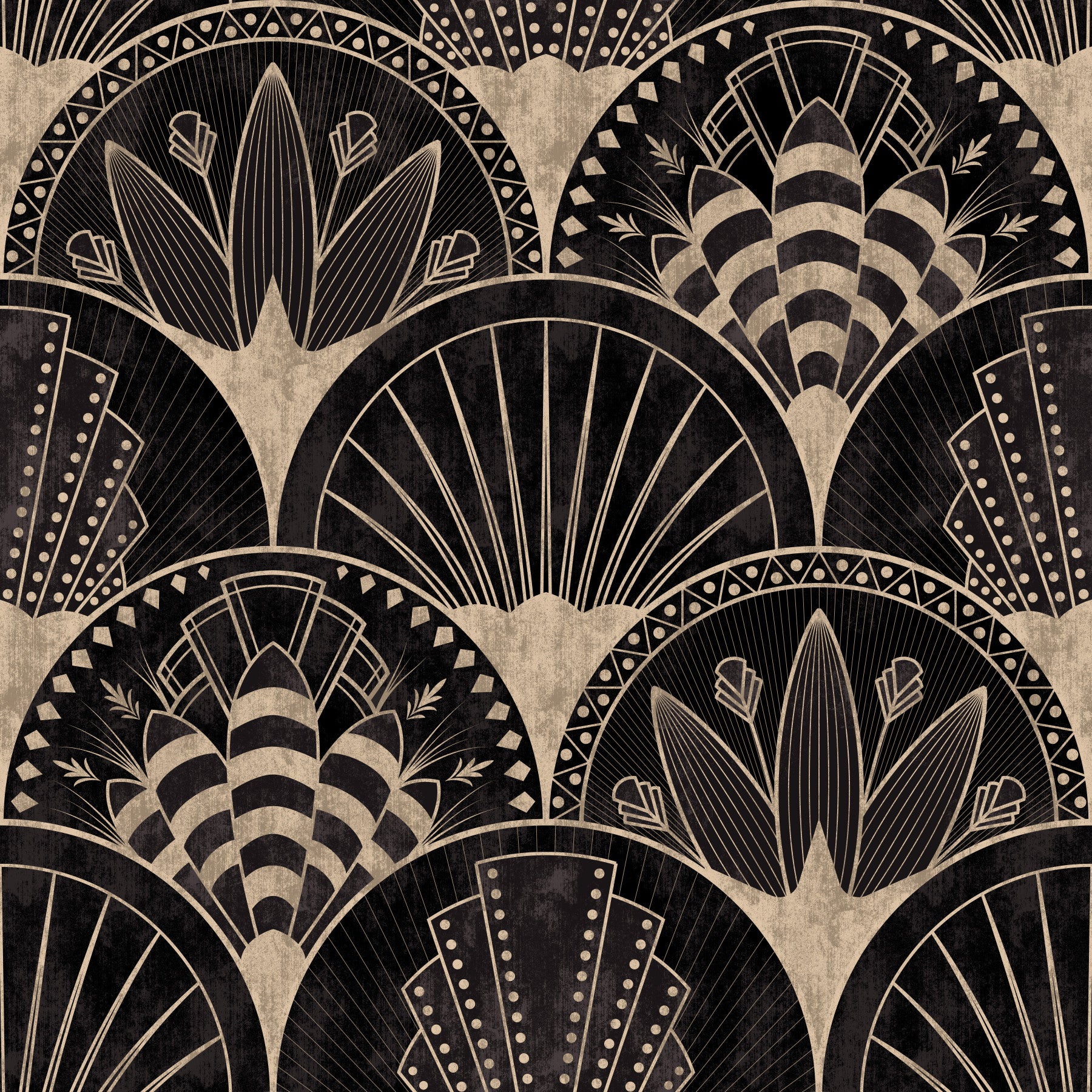 Black and gold wallpaper with fan-shaped patterns