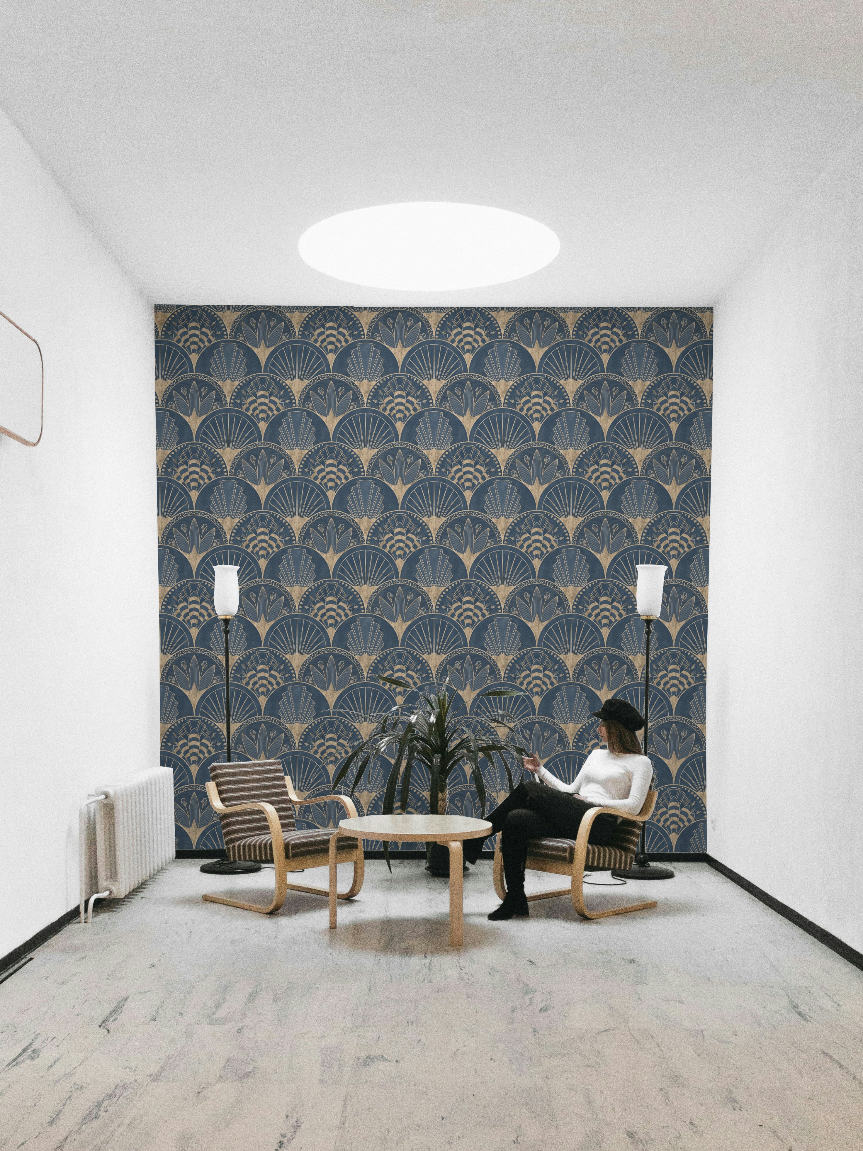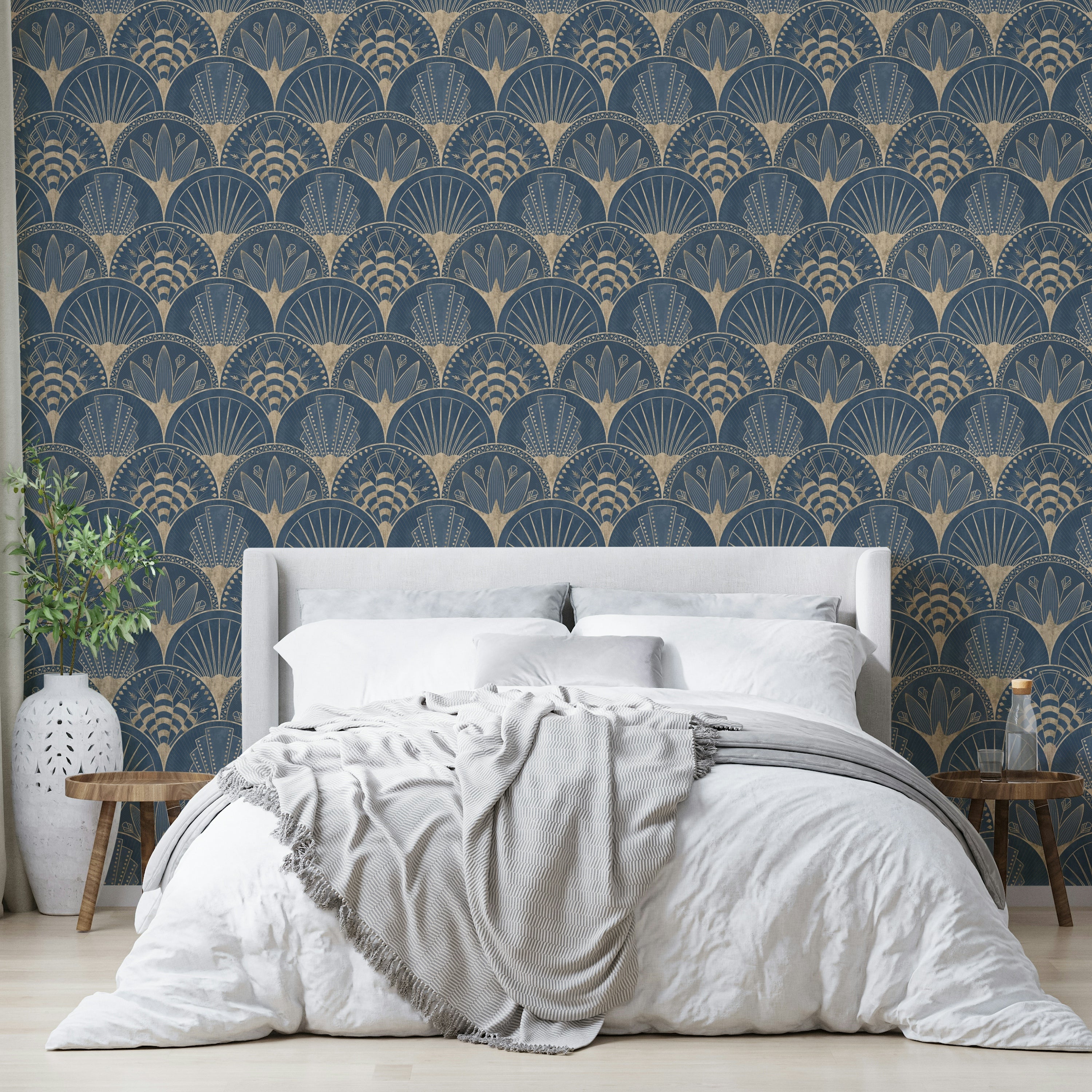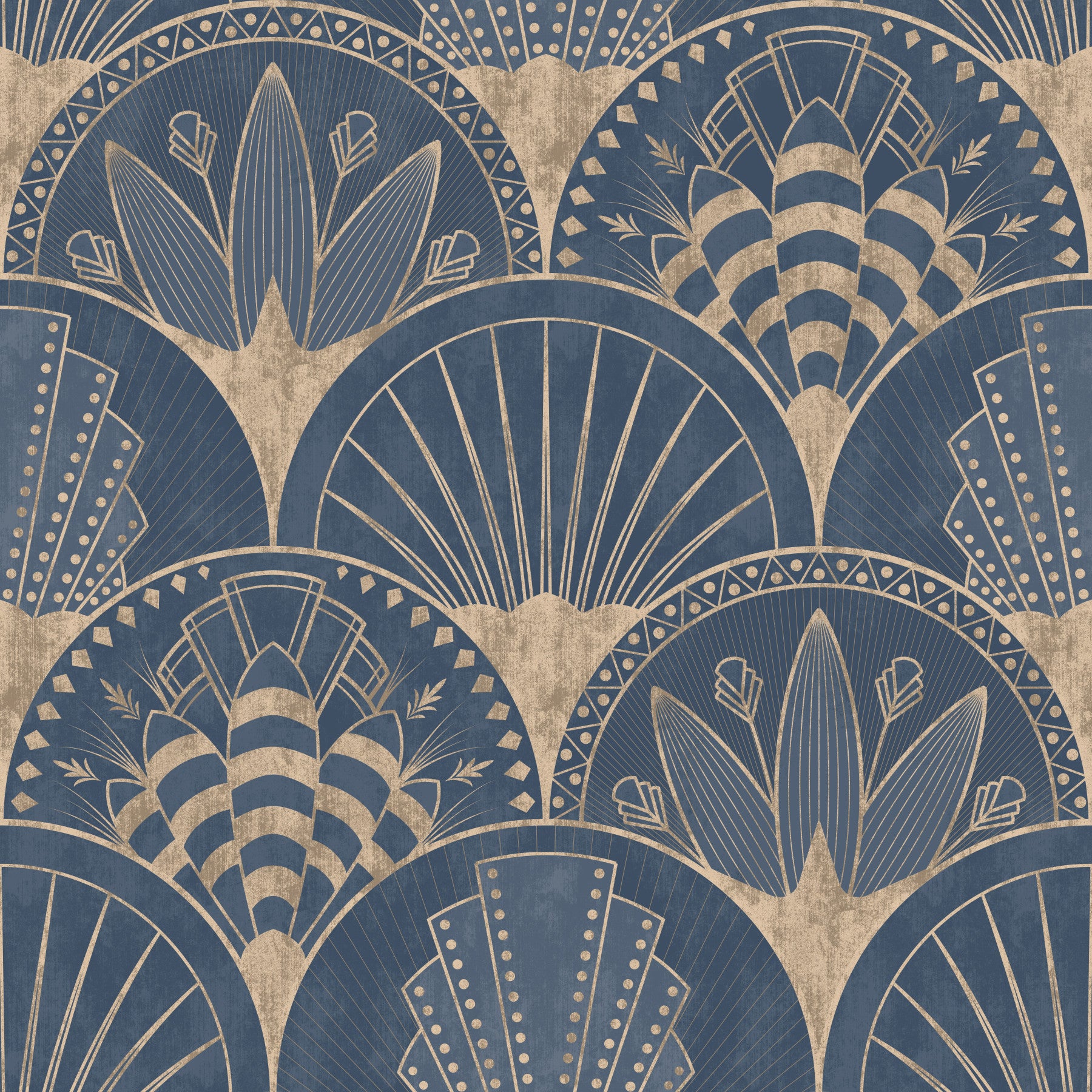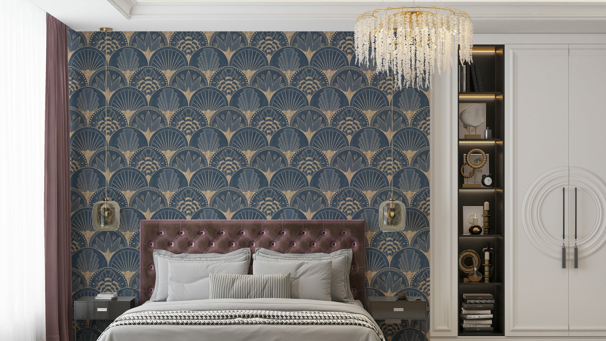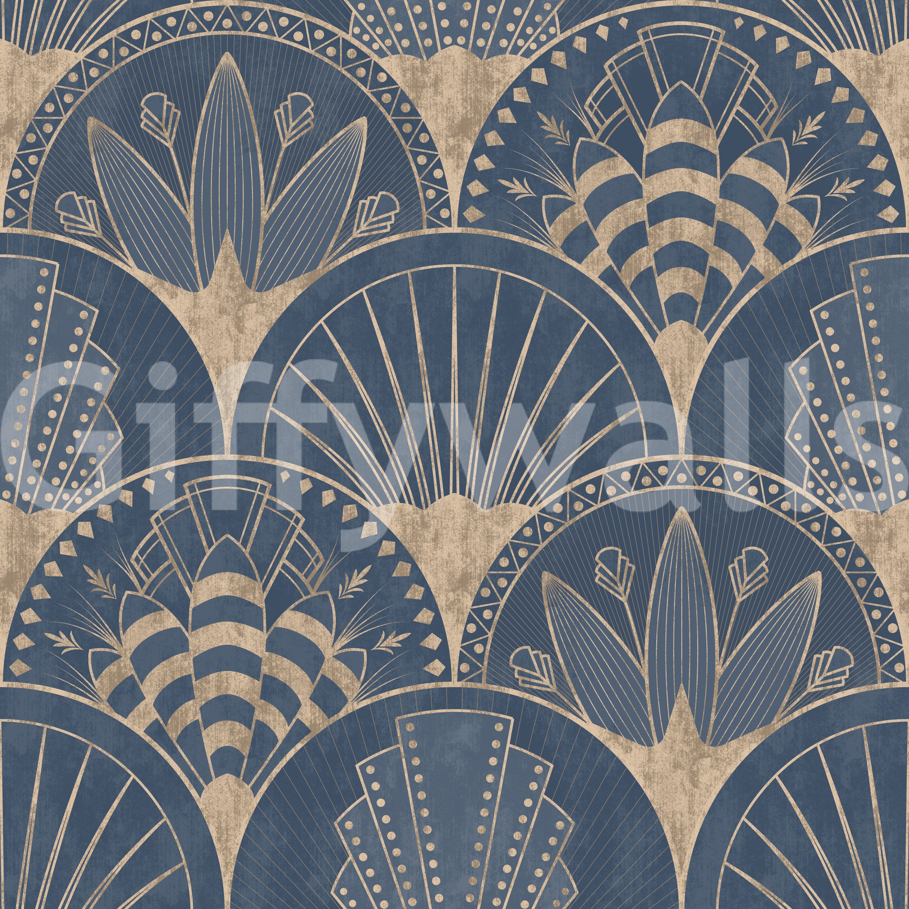 This wallpaper design exudes sophisticated elegance with its Art Deco-inspired motif. The intricate geometric patterns, featuring radiating lines and stylized floral elements, are rendered in a calming palette of deep blues and muted beige. The textured background adds a touch of vintage charm, enhancing the overall sense of refined luxury. Perfect for adding a touch of classic glamour to any space, this wallpaper is both timeless and modern, creating a sophisticated ambiance that will never go out of style. The repeating pattern ensures a seamless and harmonious look, while the colour combination creates a serene and calming atmosphere.