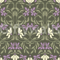 Inspired by the Art Nouveau movement, this wallpaper showcases a mesmerizing floral pattern. The stylized flowers in shades of lavender and cream dance amongst olive green leaves, creating a rhythmic, organic flow. The dark olive-green background provides a rich contrast, enhancing the vibrancy of the floral elements. This design offers a sophisticated, timeless appeal, perfect for adding a touch of artistic elegance to any room.
