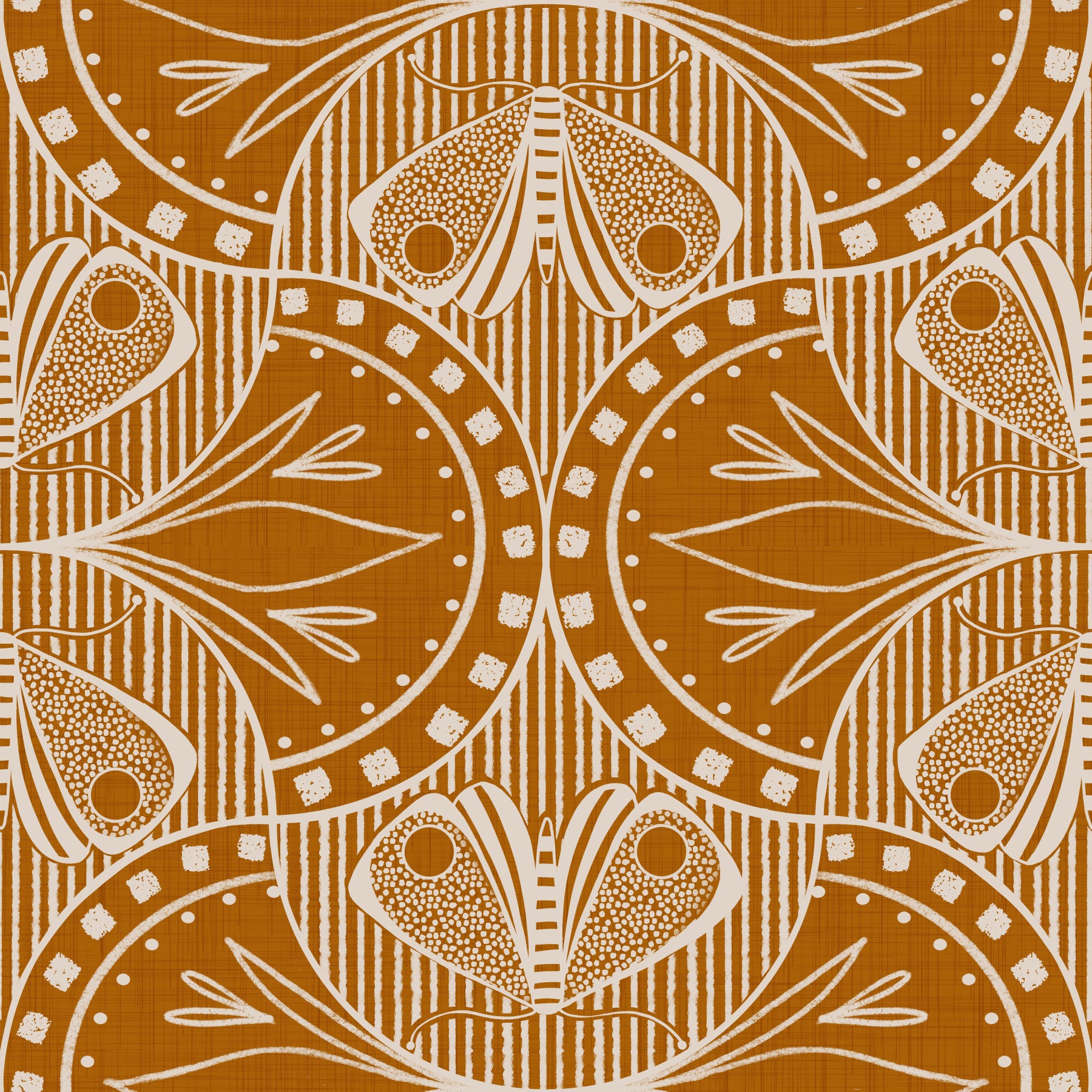 Rich Art Nouveau Butterfly or Floral in Burnt Orange symmetrical ochre earthy wallpaper.