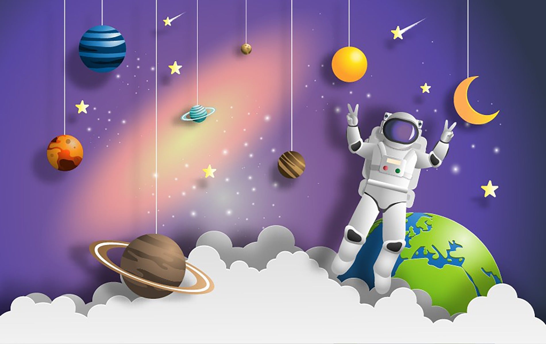 A vibrant 3D mural wallpaper depicts an astronaut on a space mission, ideal for a playroom. A distinctive purple background is used for the design, emphasizing space and mystery. The looks of this space wallpaper create an exciting and creative feel in any room. They are ideal for triggering creativity and wonderment in children. The cosmic background and the realistic astronaut body produce an interesting and active background, transforming the ordinary playroom into an interstellar one. This mural is mesmerizing for all those who want to make a playroom magical and full of discovery.