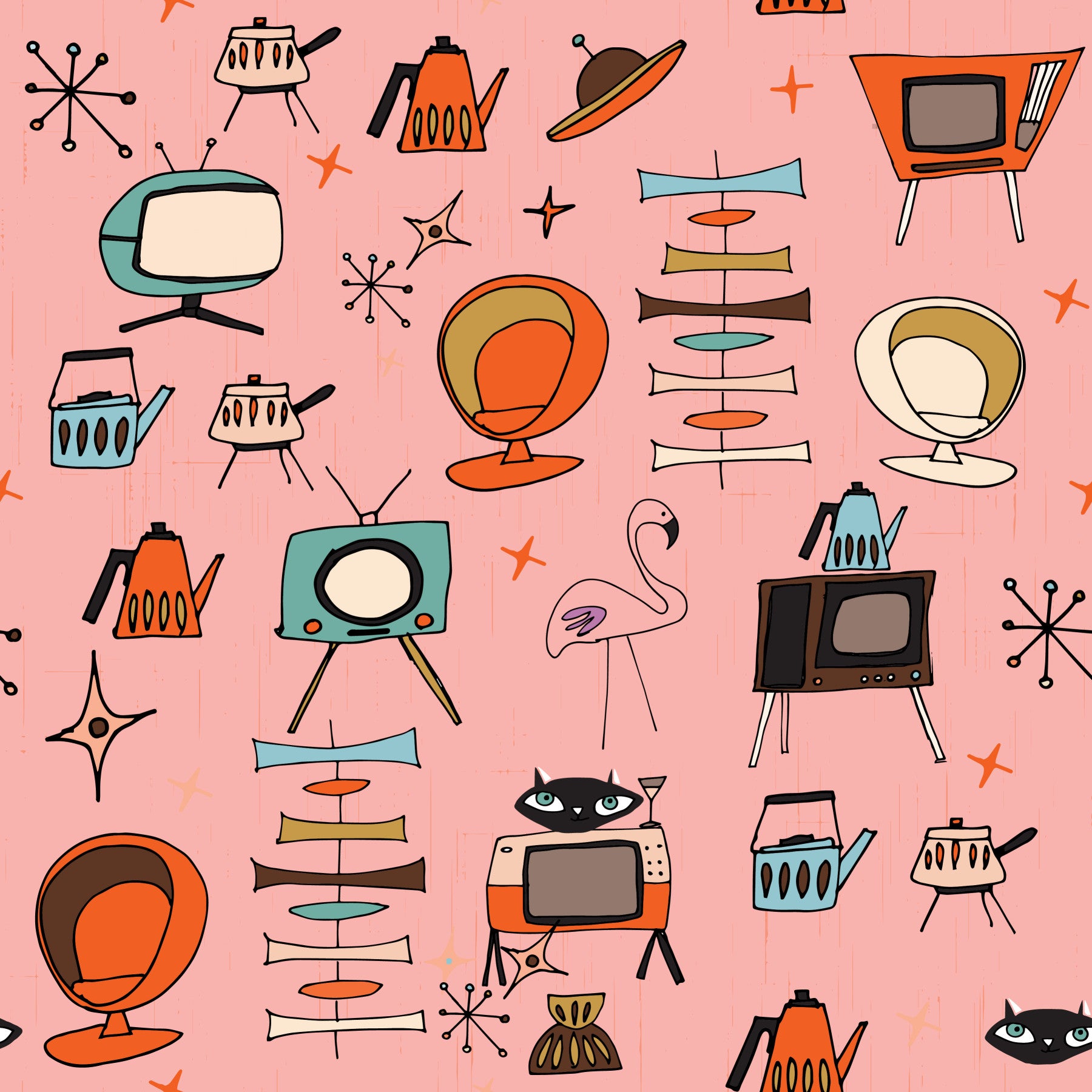 Atomic Kitsch Pink wall mural, iconic retro graphic of home items.