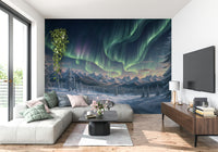 Experience the serene beauty of a winter landscape illuminated by the mesmerizing Aurora Borealis. This stunning wallpaper for walls showcases snow-covered mountains and frosted pine trees under a swirling sky of green and purple light. Transform your living room, bedroom, or hallway into a tranquil retreat with this unique design. Let the soft hues and ethereal glow of the aurora create a relaxing ambiance that complements modern, minimalist, or Scandinavian interiors. It is also a great option for your office.
