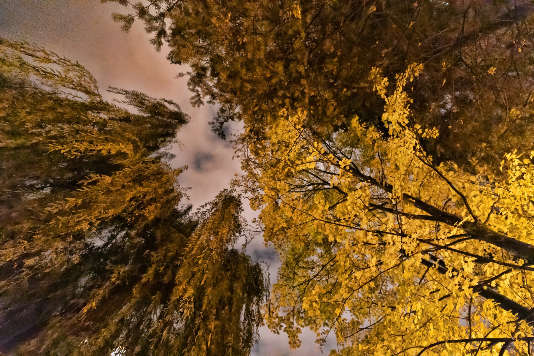 This striking photograph presents a unique perspective of autumn foliage, showcasing golden leaves intertwined with towering trees under a twilight sky. The interplay of light and shadow reveals the intricate details of nature, inviting viewers to appreciate the beauty of the changing seasons. Perfect for adding a touch of nature to your home or office, it serves as a reminder of the serene moments found in the great outdoors. Elevate your space with this captivating artwork that embodies the essence of autumn.