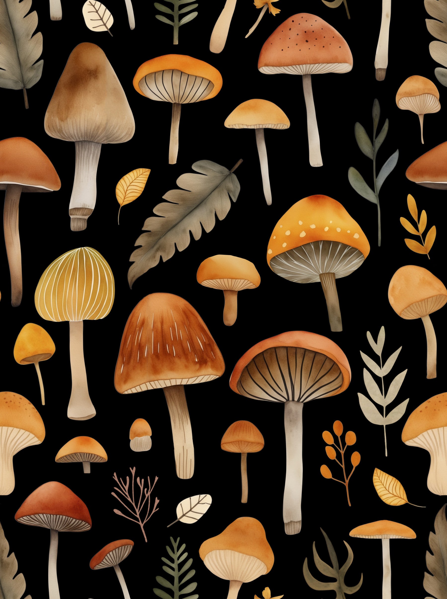 Whimsical watercolor pattern of mushrooms in warm autumn hues, perfect for cozy cottagecore styles. This charming forest design brings the magic of fall woodlands to life—ideal for seasonal home decor with a rustic touch.