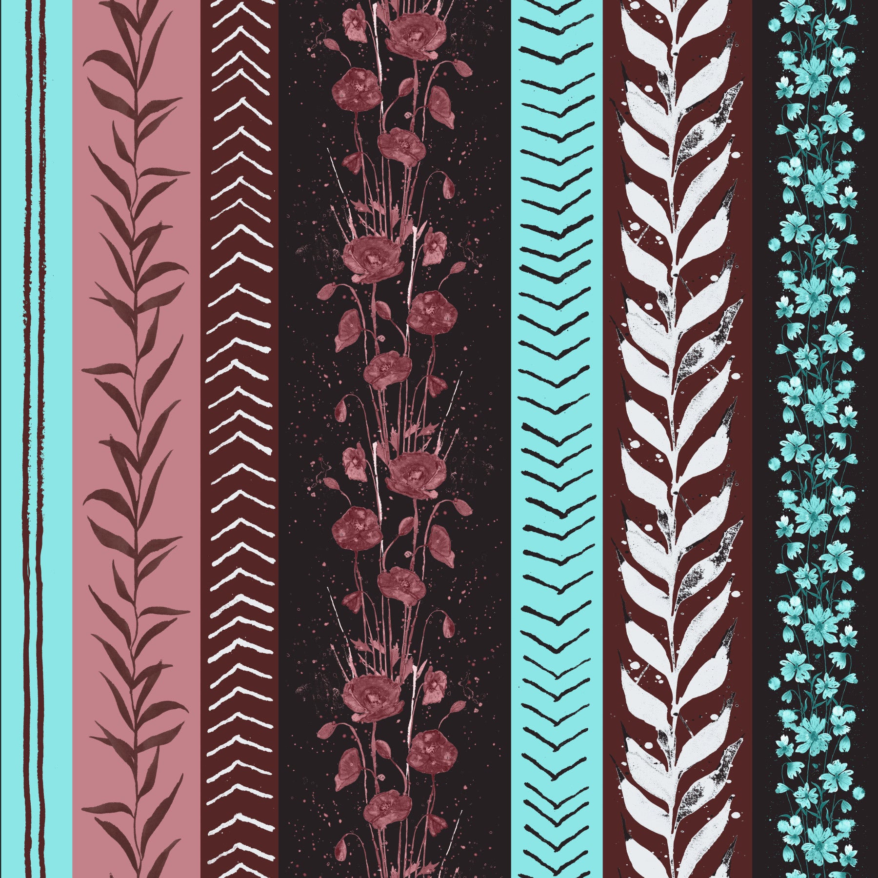 Design with a blend of light turquoise, maroon, and dark backgrounds.