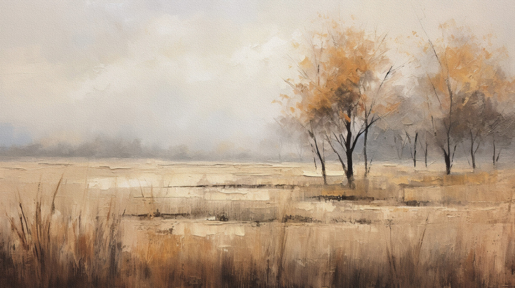 Bring the peace of the countryside inside with this scenic wallpaper for walls. The image showcases a serene landscape with trees in full autumn color. The art style lends a hand-painted feel, creating an eye-catching effect. The warm palette of browns, beige and light orange complements living rooms, bedrooms, or offices, creating a serene vibe. Give your walls a sophisticated makeover with this artful design.