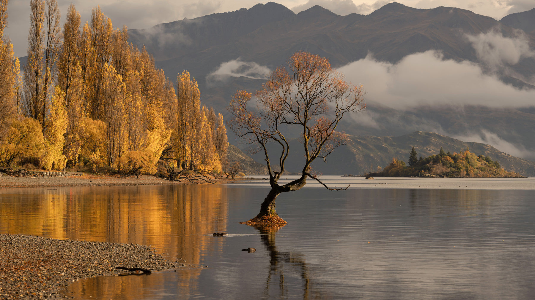 Wanaka-inspired tree at sunrise Autumn Woodland Dawn Mirror wallcovering print.