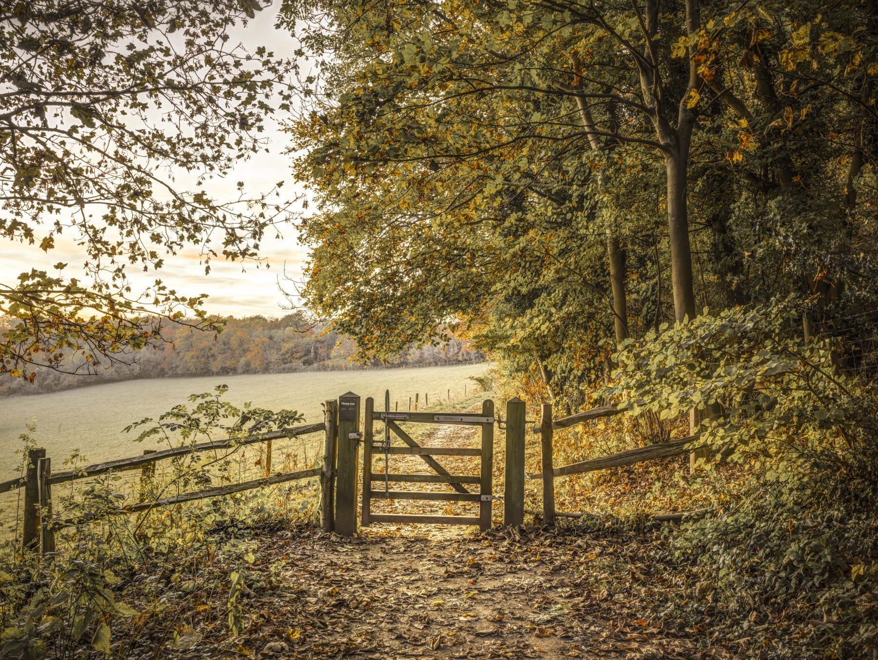 Pathway through Autumn forest. Invite nature indoors with this tranquil woodland scene. The wooden gate draws the eye, framed by trees donned in autumn colors. This design showcases warm tones of gold, brown, and green, creating a cozy ambiance. Perfect for living rooms, bedrooms, or hallways, this wallpaper for walls captures the essence of a serene countryside escape. The detailed foliage complements rustic and farmhouse interiors. Let this wallpaper transform your space into a calming retreat.