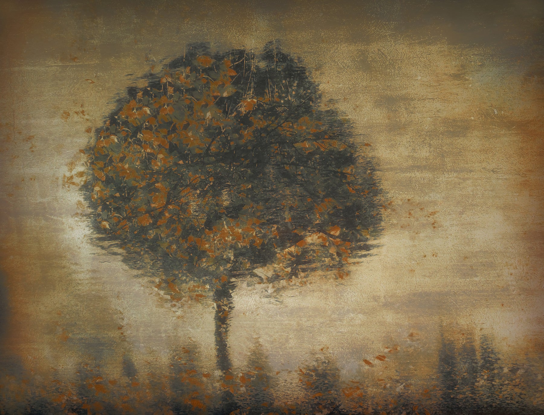 Transform your living space with this captivating wallpaper for walls. It features a lone tree with hues of autumn, set against a muted backdrop. The design evokes a sense of tranquility and natural beauty. Its rustic charm complements interiors aiming for a nature-inspired aesthetic. The warm tones create a cozy ambiance, perfect for spaces that need a touch of organic sophistication. It works exceptionally well in living rooms, bedrooms, or studies, adding a focal point that is both timeless and elegant.