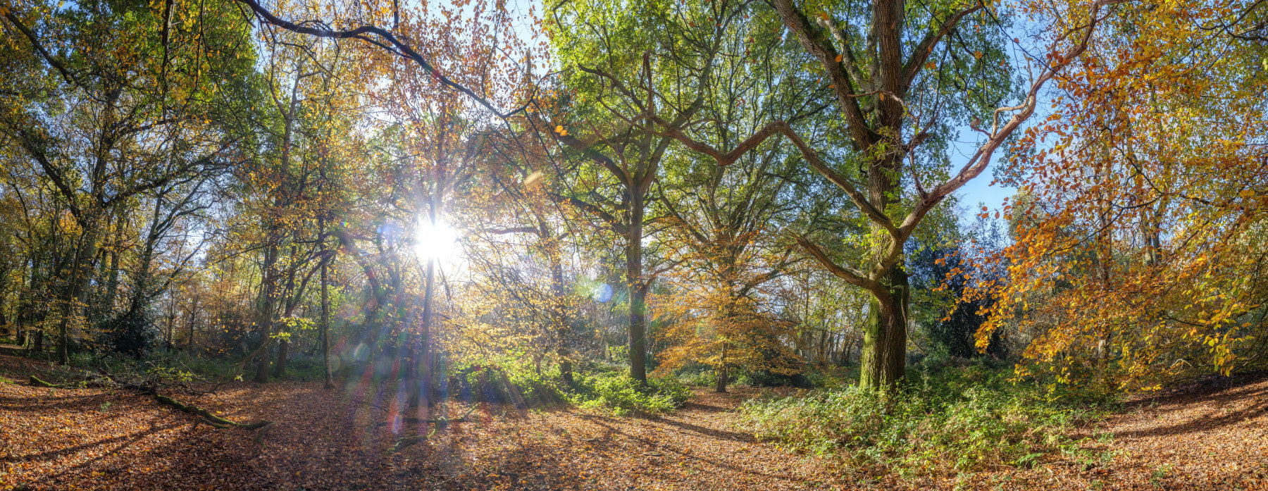 Bathed in the golden light of a crisp autumn day, this wallpaper captures the serene beauty of a sun-dappled forest. The vibrant hues of orange, yellow, and green leaves create a warm and inviting atmosphere. Sunlight streams through the canopy, casting long shadows on the carpet of fallen leaves below, creating a mesmerizing play of light and shadow. This image evokes feelings of tranquility and peace, making it ideal for creating a calming and nature-inspired space in your home or office. The detail in the trees and the leaves offers a captivating scene that is both peaceful and visually striking.