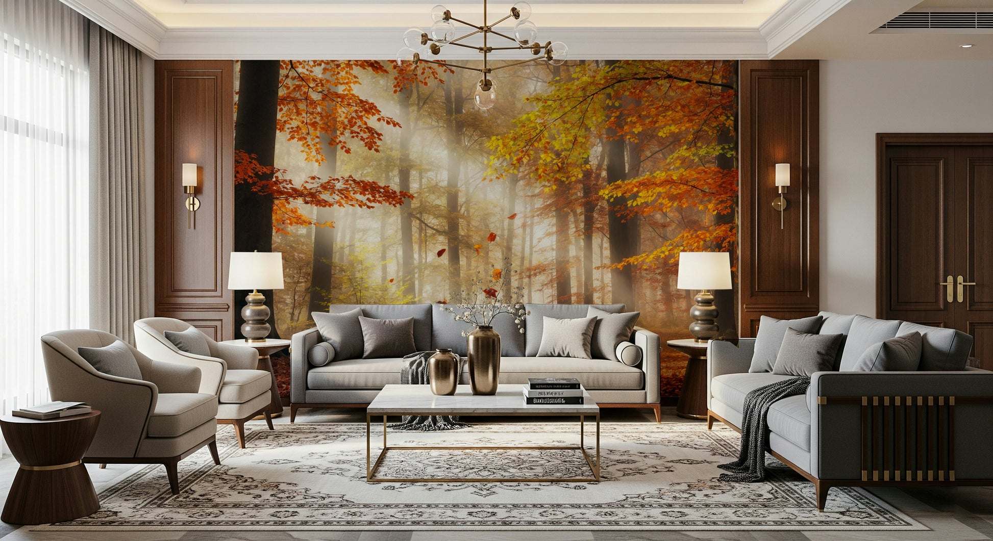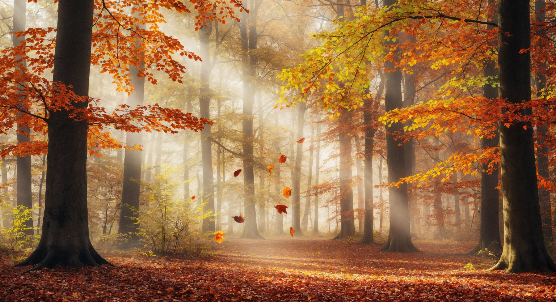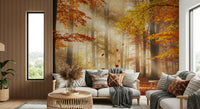 Transform your space with this striking forest image. It presents a scene where sunlight filters through trees, illuminating falling leaves. This wallpaper for walls shows nature's beauty and creates a peaceful atmosphere. The warm colors and soft light make it a great addition to a living room, bedroom, or home office. It enhances interiors with a sense of calm and connection to nature, creating a warm, inviting ambiance.