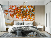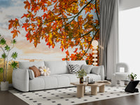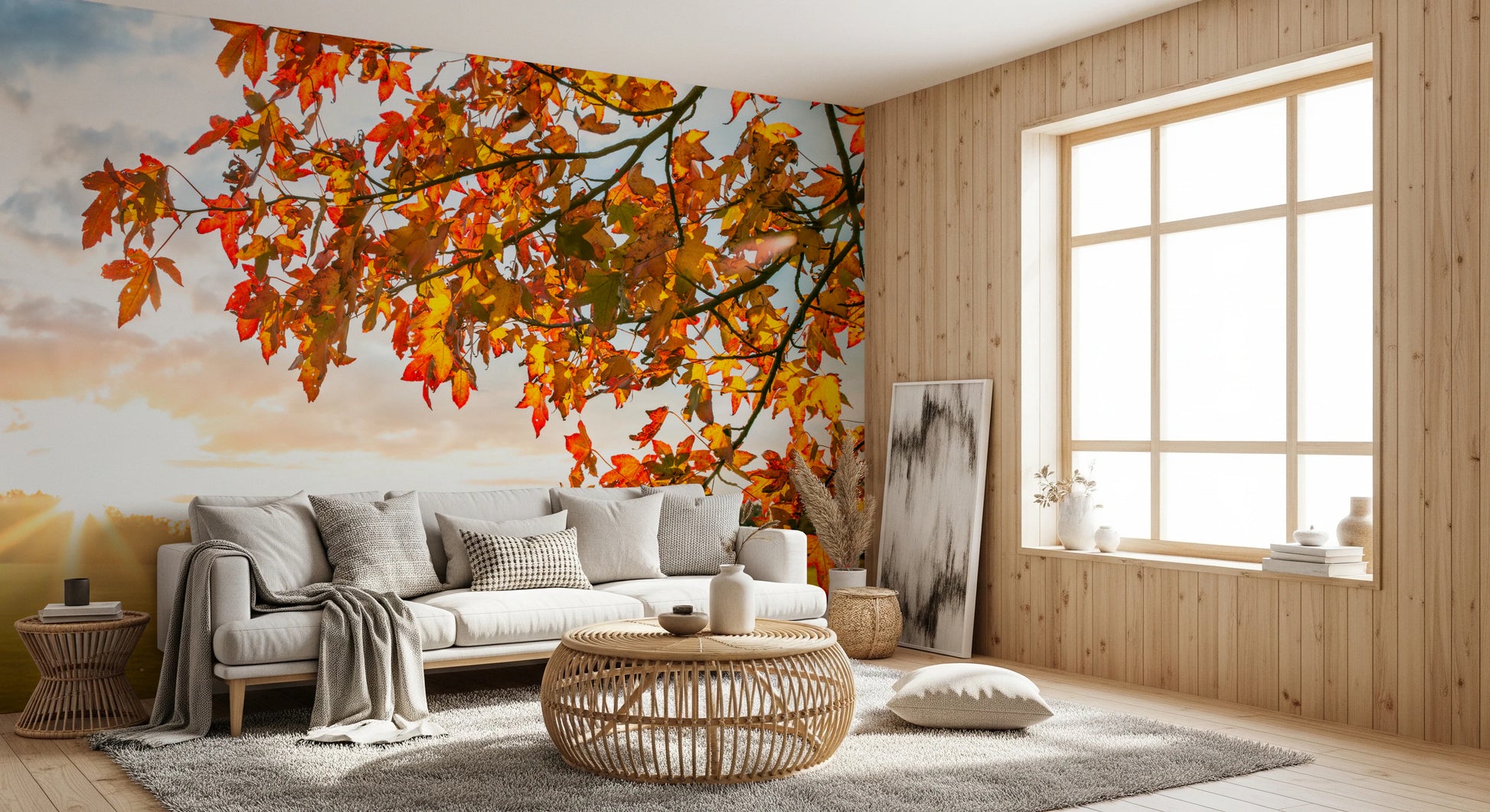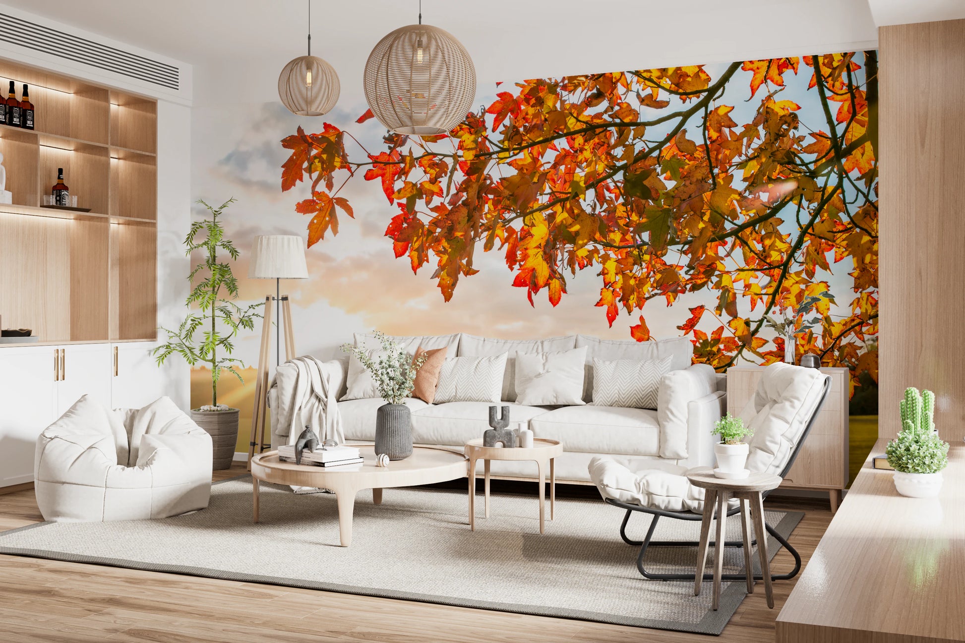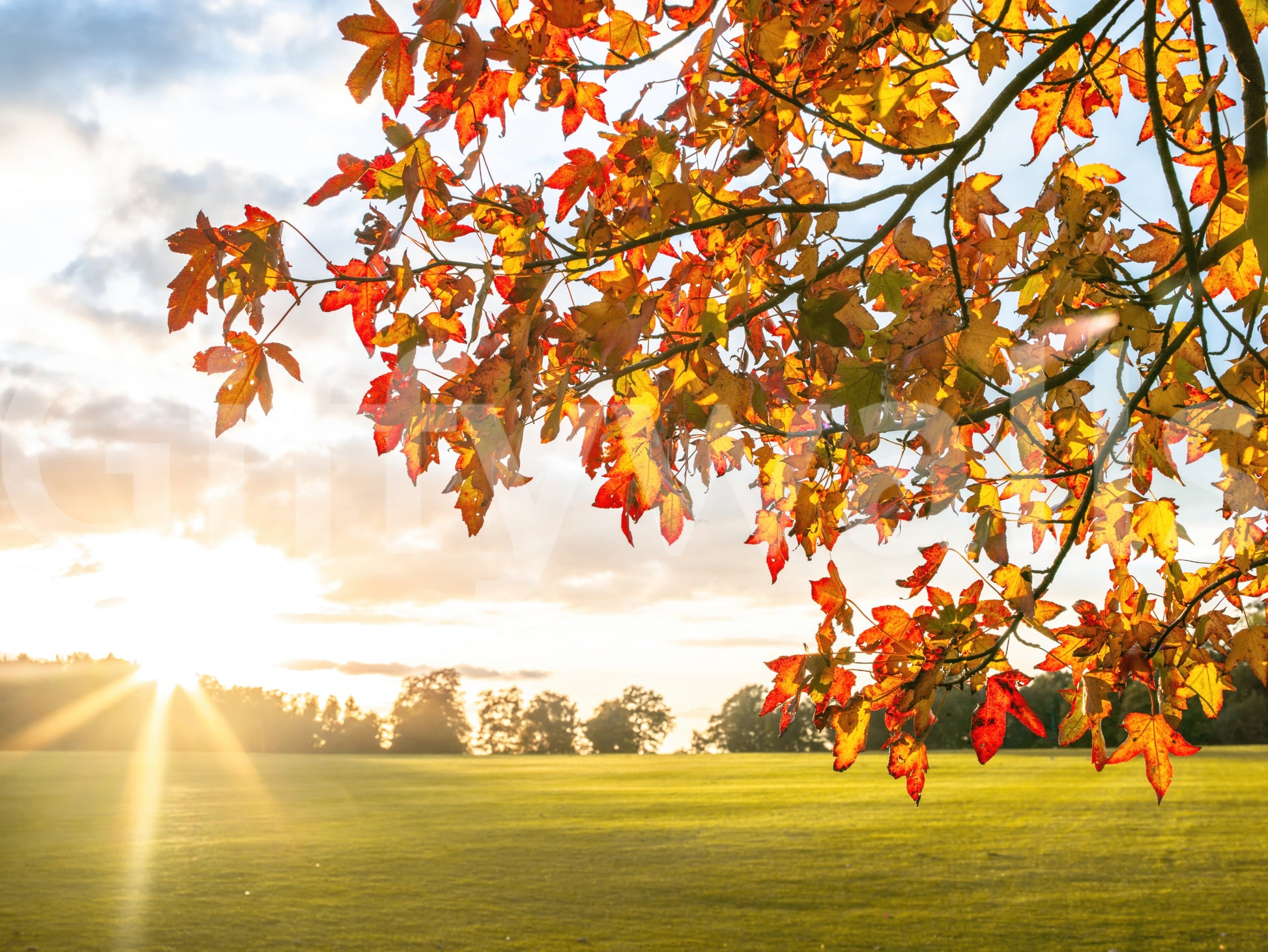 Sun Rays and coloured leaves at autumn. Embrace the warmth and beauty of the season with 'Autumn's Golden Symphony'. This captivating image evokes the serene feeling of a crisp autumn afternoon, where nature displays its most vibrant colors. A symphony of golden, amber, and crimson leaves adorn a gracefully arching branch, illuminated by the soft, radiant glow of the setting sun. The sunlight bathes a tranquil meadow in a warm, ethereal light, creating a peaceful and inviting ambiance. Transform any room into a sanctuary of autumnal charm with this stunning image, perfect for adding a touch of natural elegance and serene beauty to your living space.