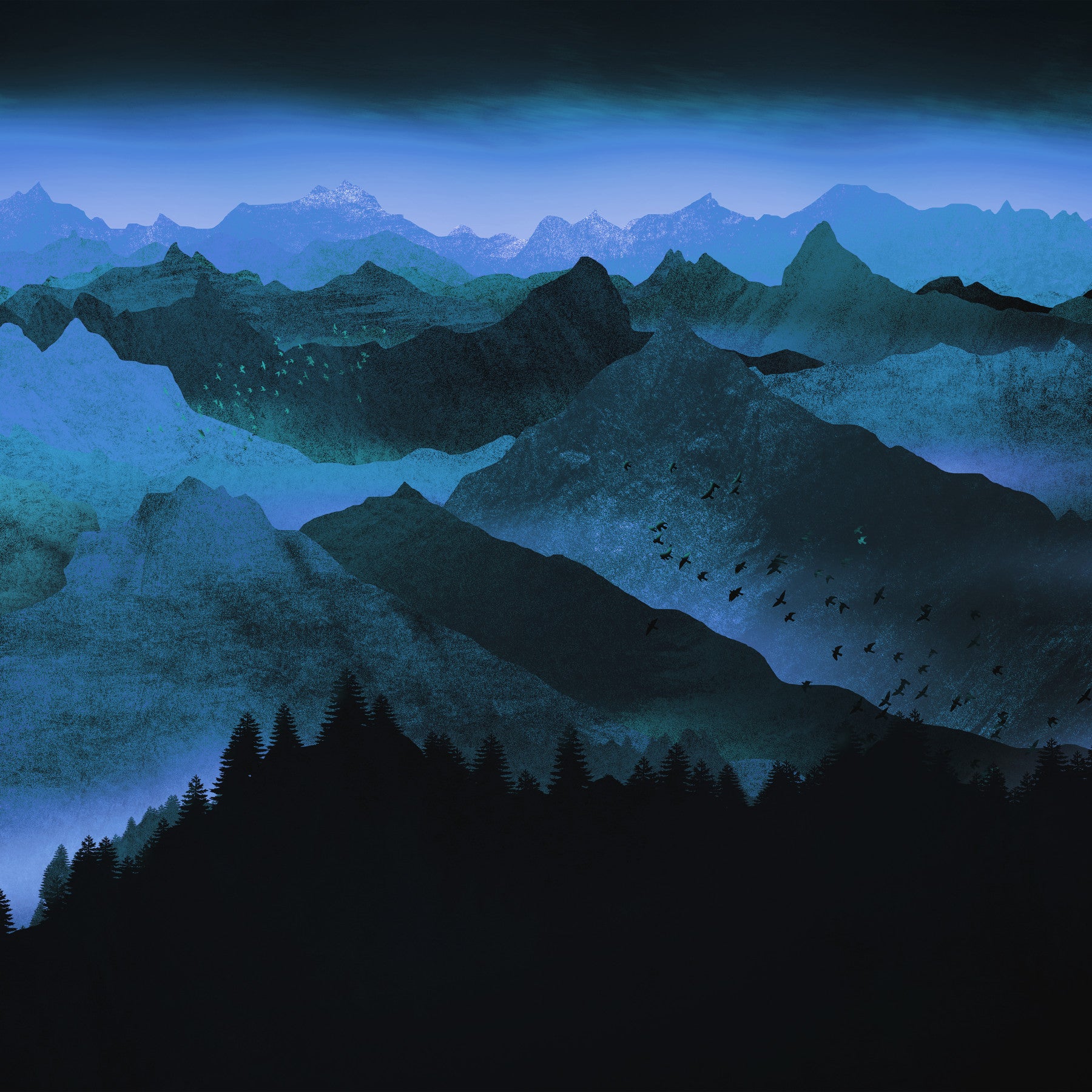 Behold the majestic beauty of 'Azure Mountain Majesty,' a digital wallpaper that captures the essence of a tranquil mountain landscape. The image is dominated by varying shades of azure and deep blue, creating a mesmerizing layered effect. Silhouetted trees and a flock of birds add depth and subtle movement to the scene. The textured, almost painterly quality adds a unique artistic touch. The wallpaper is ideal for anyone looking for a calming and sophisticated backdrop for their screens, evoking feelings of serenity and wonder. Let this captivating vista transport you to a realm of peaceful contemplation.