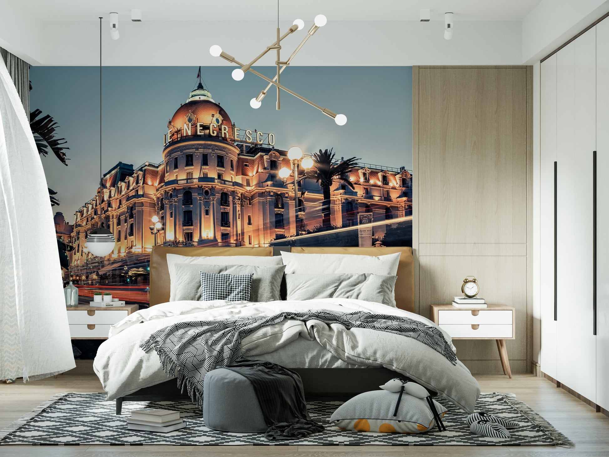 Transform your living spaces with this sophisticated depiction of a Riviera cityscape at twilight. Featuring an iconic building illuminated against the darkening sky, this wallpaper for walls brings a touch of old-world glamour to any room. Streaks of light capture the vibrant energy of the city streets, creating a sense of movement and excitement. The blend of cool blues and warm oranges creates a calming yet elegant atmosphere, ideal for a bedroom, living room, or dining area. Enhance your home with the timeless beauty of the French Riviera.