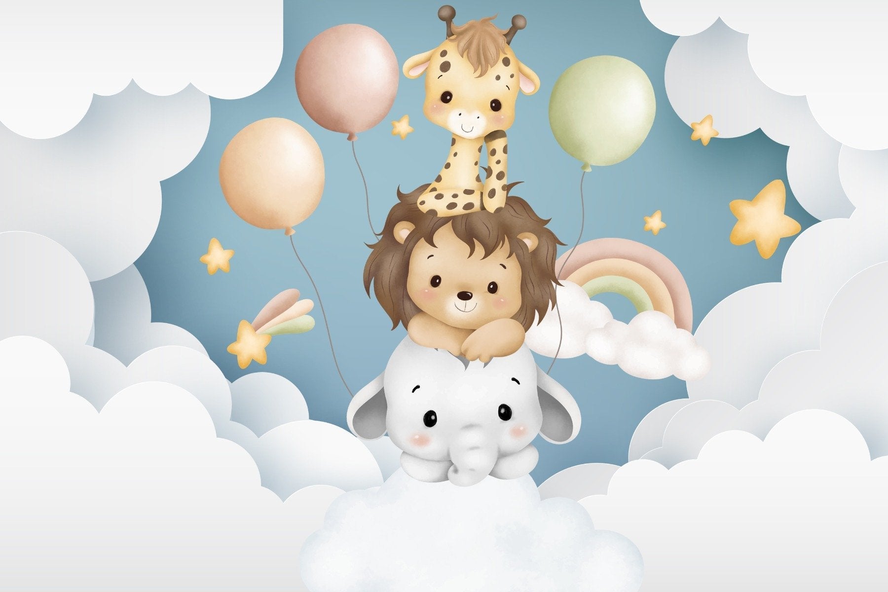 The baby animal balloon fiesta mural is a delightful ensemble of joyous animals taking to the skies in a whimsical hot air balloon journey. As nursery wallpaper, it infuses the room with the playful spirits of a lion cub, giraffe, and their adorable friends, each riding atop fluffy clouds. Ideal for sparking youthful imaginations, this sky safari animal wallpaper mural turns any playroom into a sky-high adventure. The soft pastel balloons add a touch of whimsy while the stars and rainbows sprinkle magic across the mural. It's more than just wallpaper. It's a celebration of playful discovery, where every day brings a new flight of fancy among the clouds, making it a perfect addition to spaces where little ones dream and play.