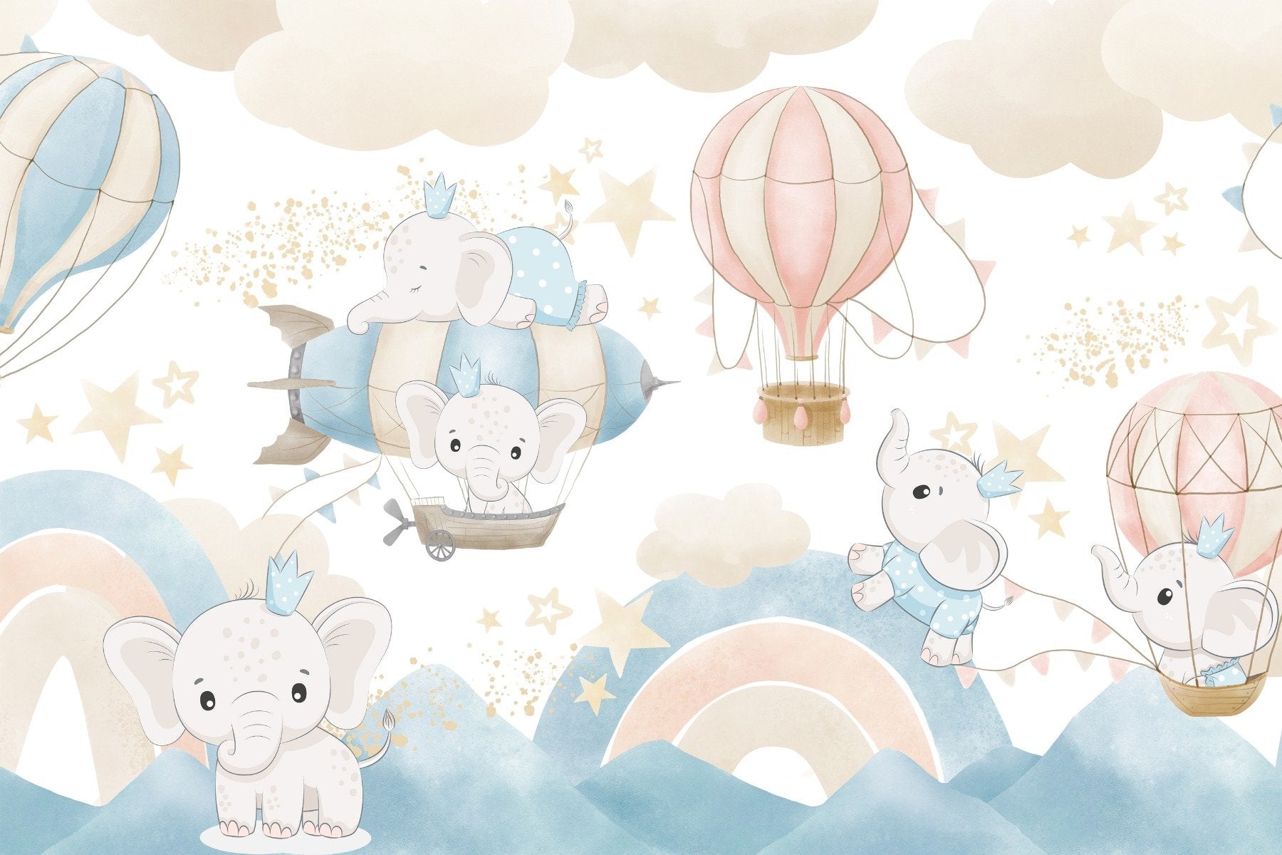 Adorable Baby Elephant Sky Adventure Mural for nurseries