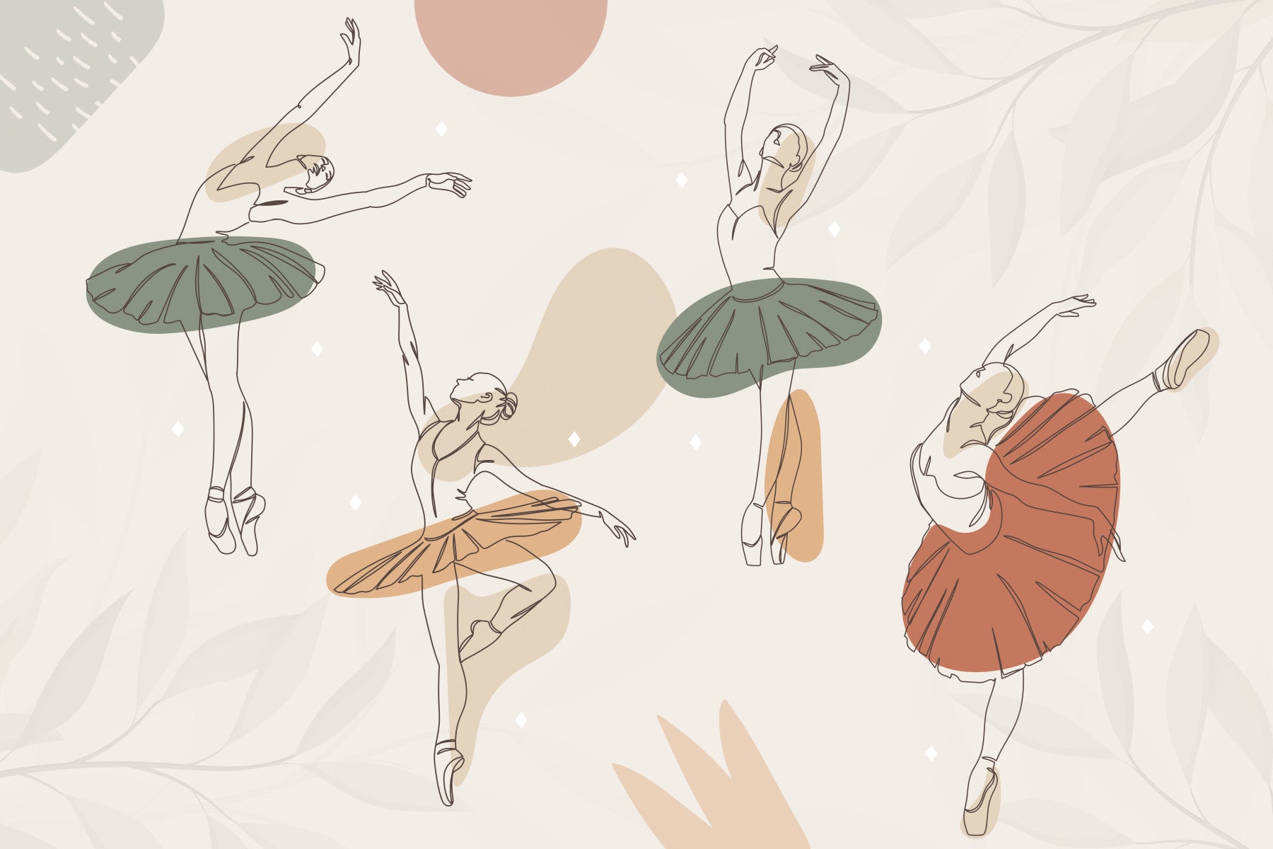 Elevate your space with this elegant ballet-themed wallpaper for walls. The minimalist design features graceful ballerinas in motion, rendered in a stylish line art against a backdrop of soft, neutral tones. Green and red details bring a touch of color. It's ideal for a bedroom, living room, or dance studio, adding sophistication. The calming palette and graceful figures introduce a touch of serenity to your interiors.