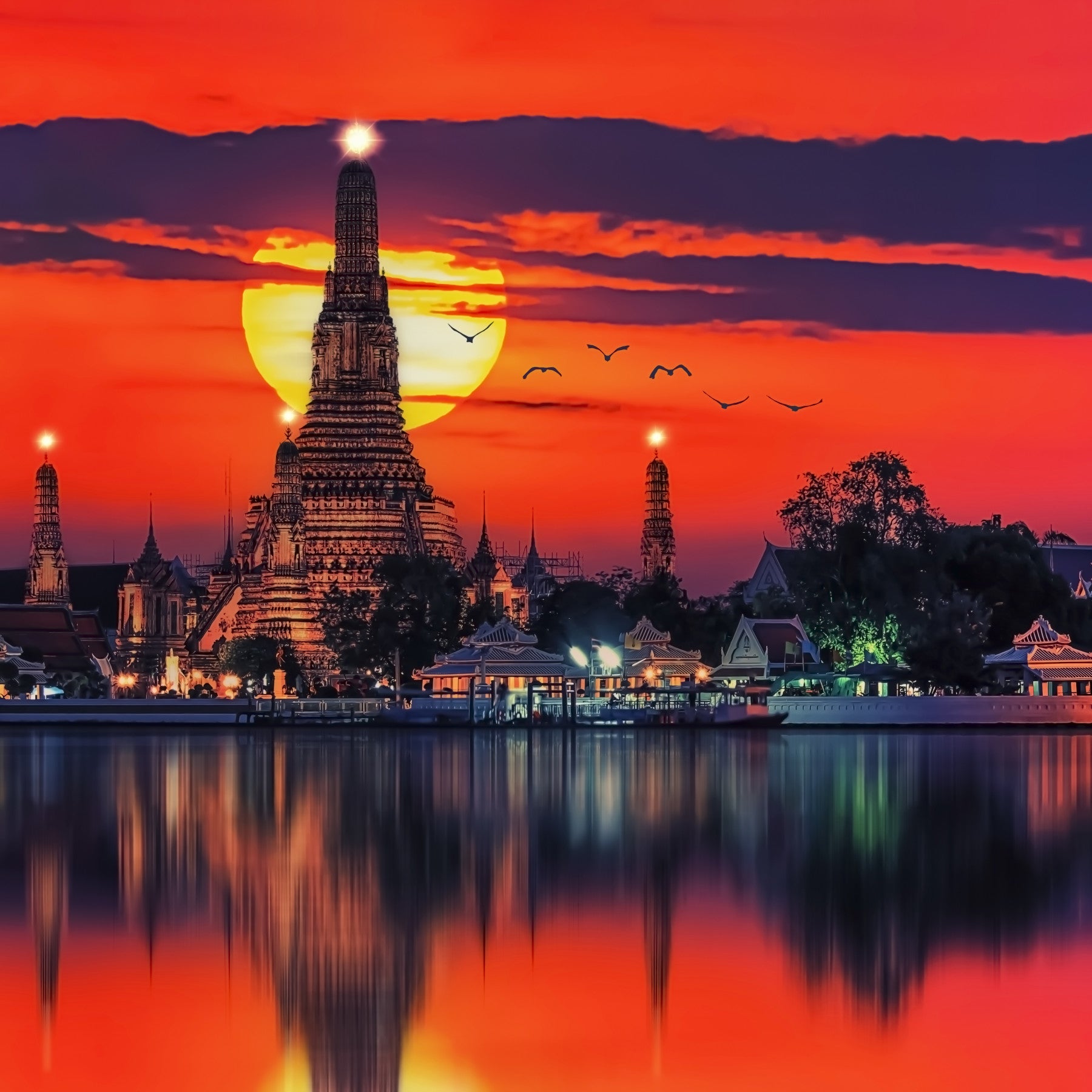 This striking wallpaper for walls presents a dramatic sunset over Bangkok, Thailand. The Wat Arun temple complex glows against a vibrant red and orange sky, mirrored in the water below. This design adds a touch of exotic elegance to any room. Consider this captivating piece for a living room, dining area, or hallway to make a grand statement. It can also add a unique style to a home office or library space.