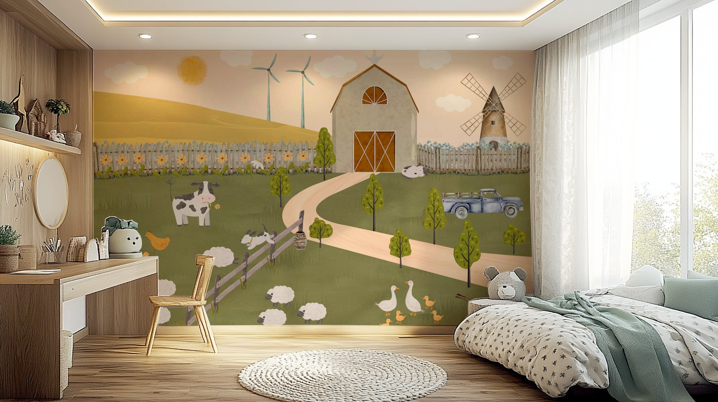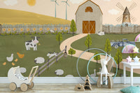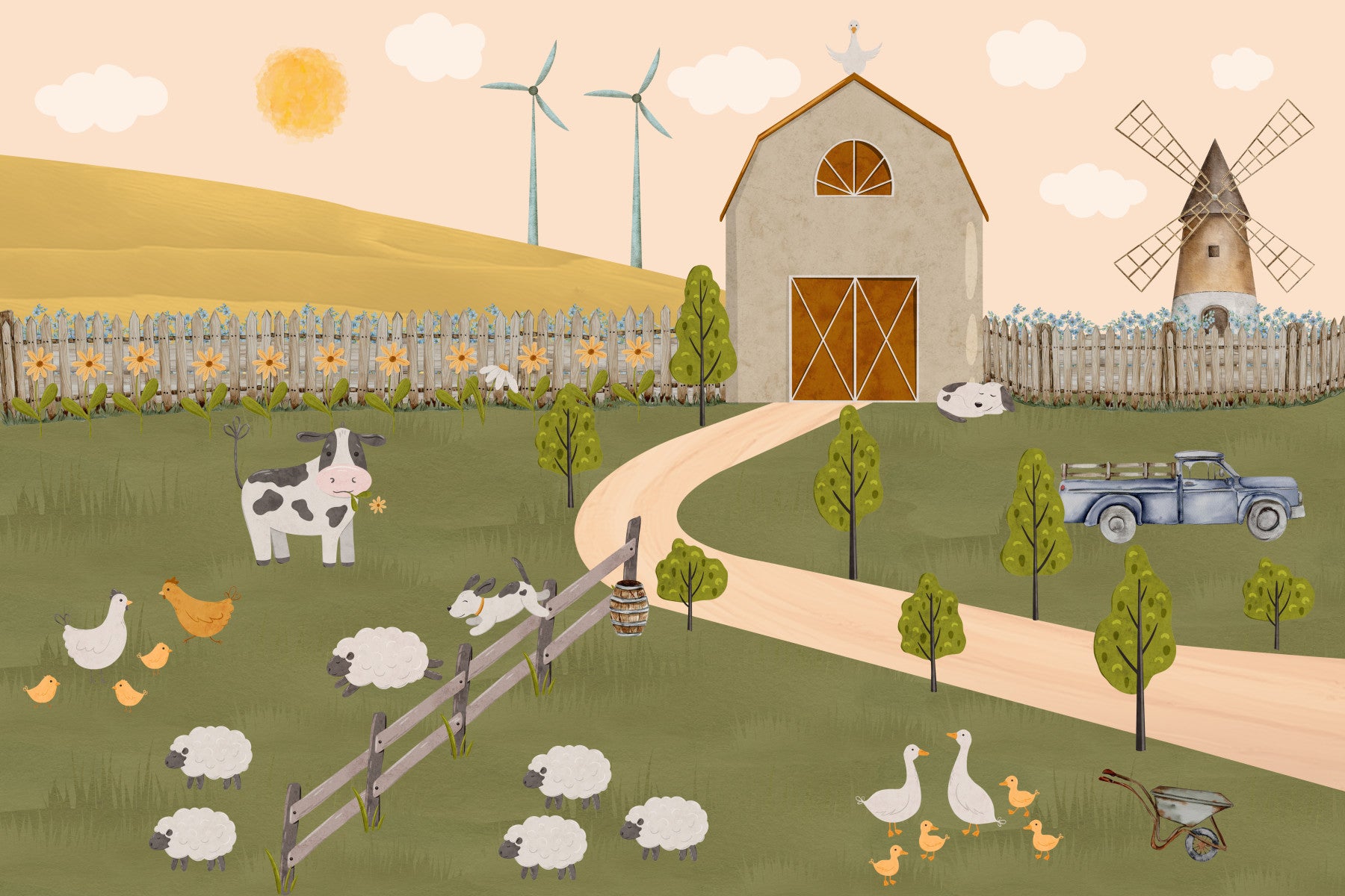 Introduce a tranquil farm aesthetic with this engaging wallpaper. The lively scene presents cows, sheep, and ducks interacting among quaint barns and windmills, all portrayed in a charming, illustrative style. Earthy greens, sunny yellows, and creamy neutrals create a welcoming environment. Perfect wallpaper for walls in a nursery, kids' room, or breakfast nook. The design gently transforms any room into a cozy haven that radiates country charm.