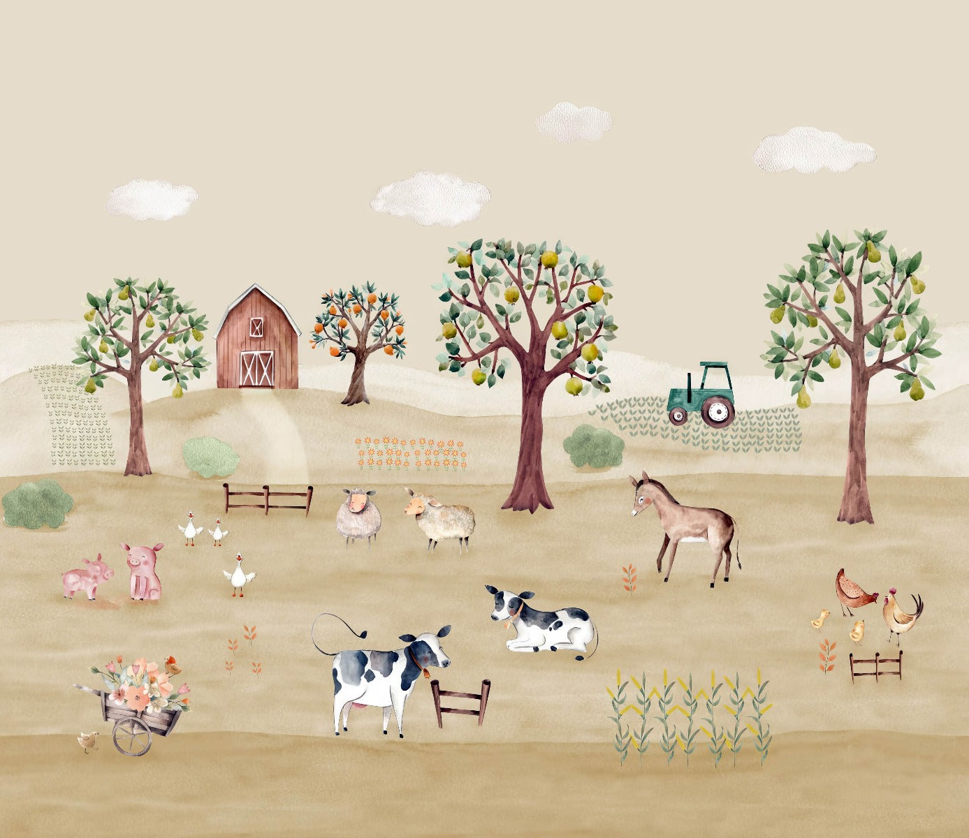 The barnyard bliss mural is the perfect addition to your child's nursery. This nursery wallpaper represents a fantastic farm scene that evokes curiosity and delight in young minds. The soft tones of the landscape mix with the very detailed animals to create an engaging atmosphere. Every piece is crafted to promote love for nature and farm life, promoting educational play and discovery. Made from premium quality materials, this mural is tear-resistant. It maintains its beauty in all the rigours of daily life to provide a good focal point that teaches and adorns. This fantastic setting enhances the room's beauty, but it will also be one of the excellent tools for teaching children about other animals and rural life.