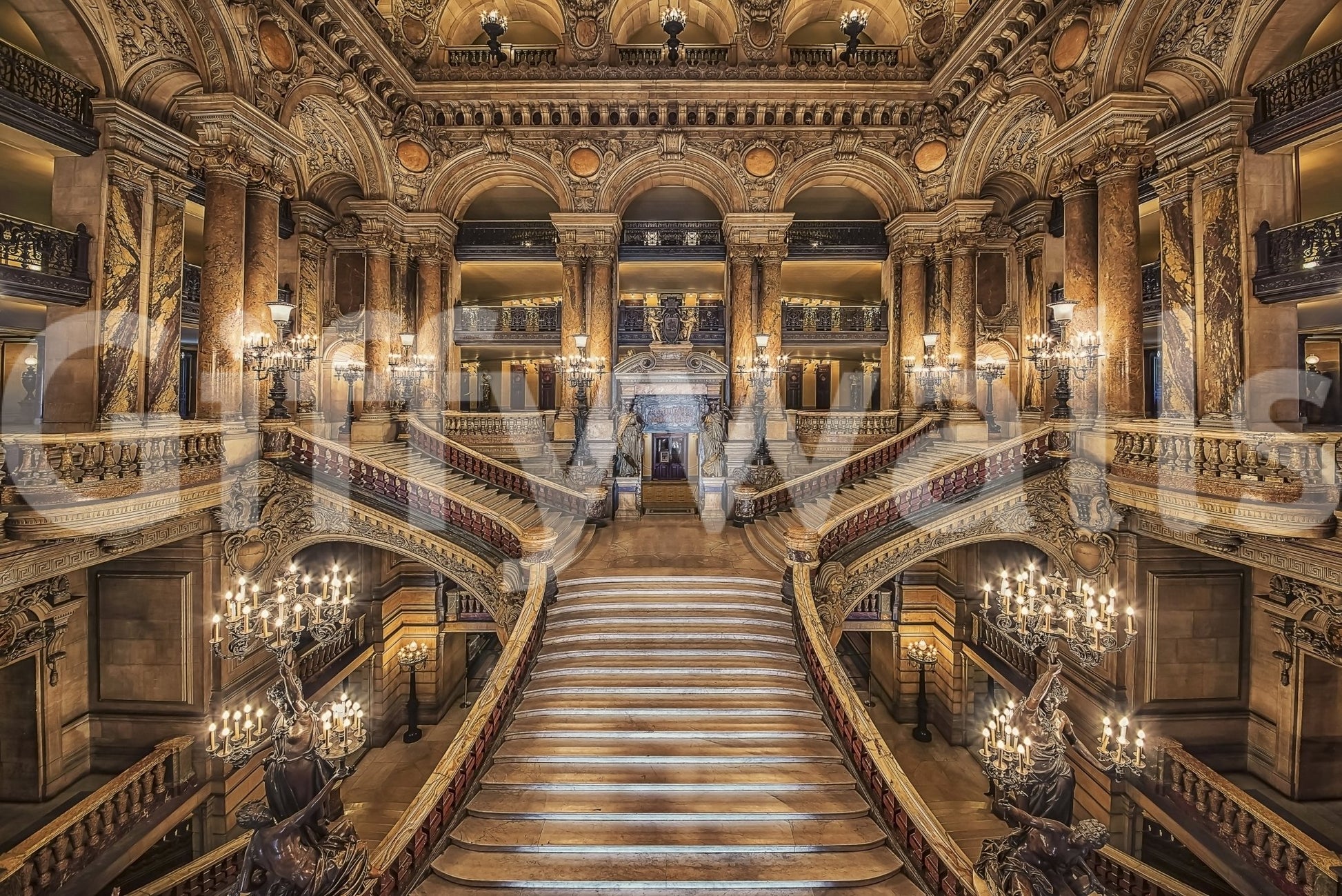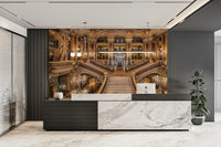 Elevate your space with a wallpaper that echoes timeless grandeur. The image showcases a majestic staircase framed by baroque detailing, marble accents, and glowing candelabras. Warm beige tones dominate the design, imparting a sense of old-world charm. This wallpaper for walls makes a statement in entryways, libraries, or home offices, enhancing interiors with an air of cultural richness. Opt for gold accents to complement its decadent style.