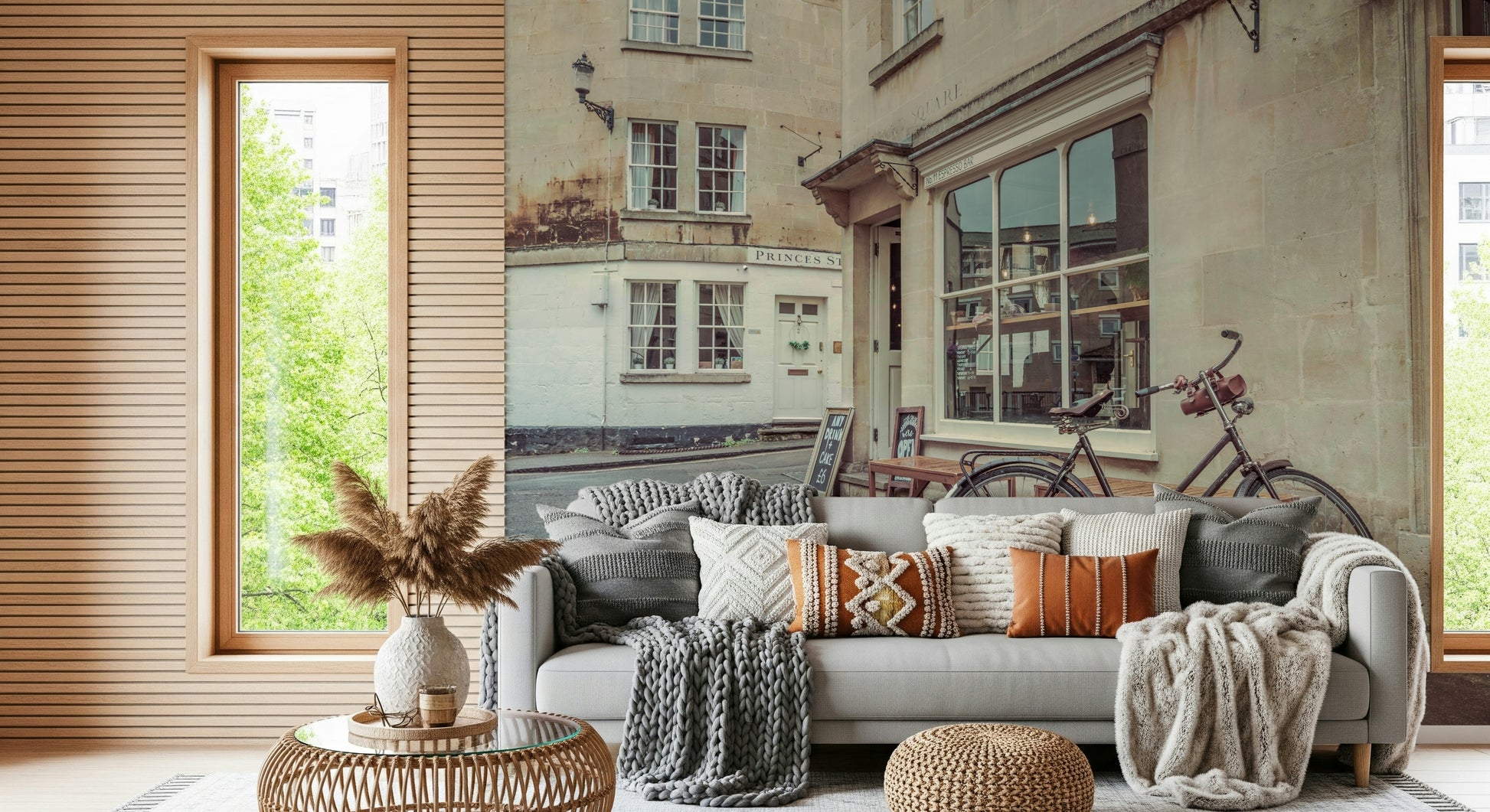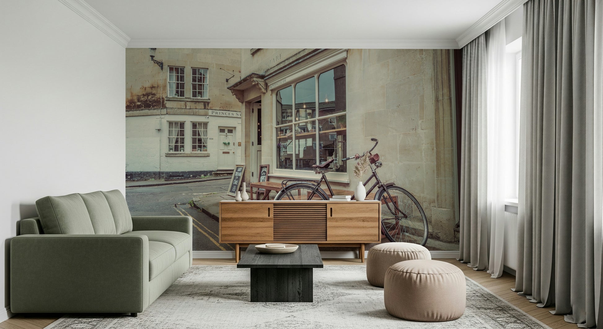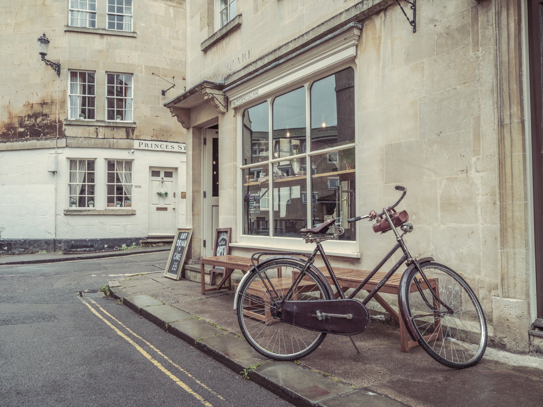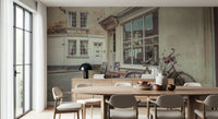 Bicycle parked outside cafe in Bath. Introduce a hint of British charm with this wallpaper for walls. It presents a serene street view from Bath, England. A vintage bicycle leans against a stone building, evoking a peaceful, everyday scene. The neutral tones and architectural details create a calming atmosphere, making it ideal for a study or living area. The design complements interiors with a touch of sophistication, perfect for bringing a bit of European elegance into your home.
