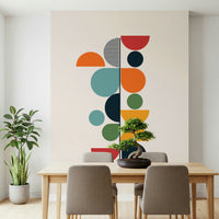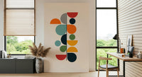 Embrace the essence of rejuvenation with 'Bauhaus - Spring', a striking geometric design that embodies the spirit of renewal. This composition of clean lines and bold circular forms captures the Bauhaus aesthetic with a touch of seasonal vibrancy. Hues of sunny orange, warm red, and earthy green are juxtaposed with calming teal and deep blues, evoking the awakening of nature. The deliberate arrangement of semi-circles and full circles creates a dynamic visual rhythm, drawing the eye upward, reminiscent of new growth reaching for the light. A subtle striped detail adds a layer of texture and visual interest to this modern piece. Bring the fresh, optimistic energy of spring into your living space with this unique wall décor, ideal for creating a focal point that is both timeless and contemporary.