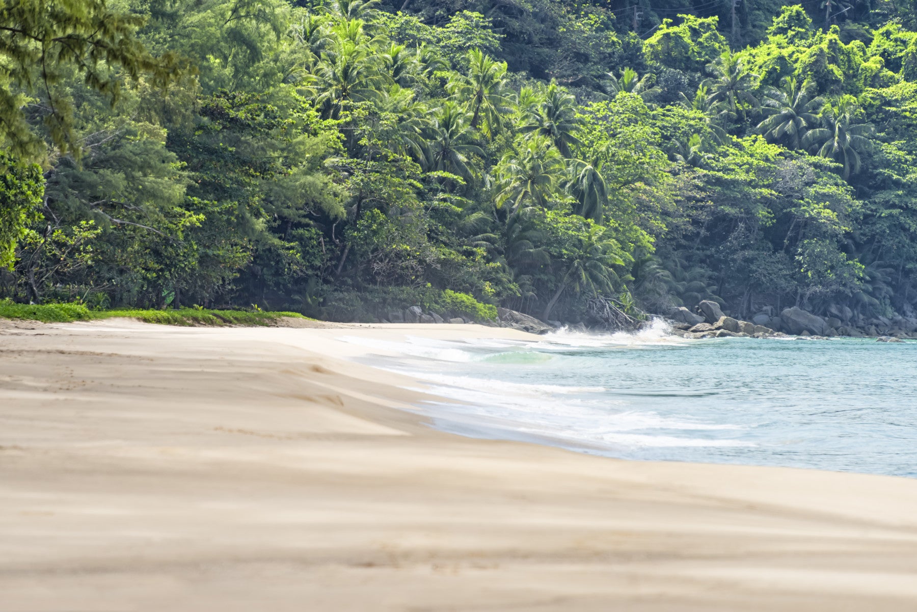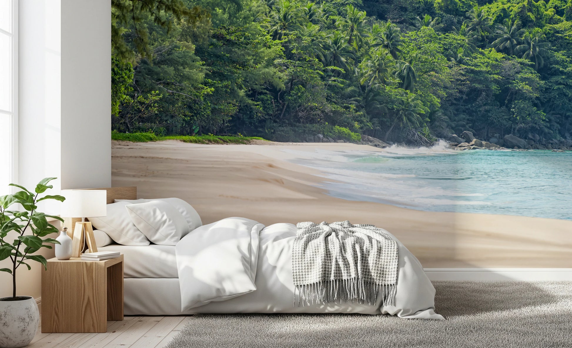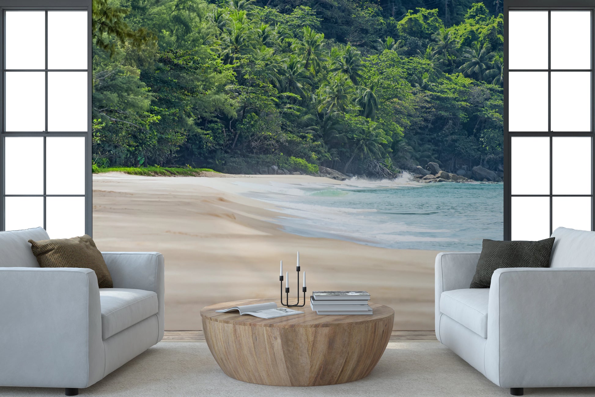 Bring the serenity of a tropical beach into your home with this stunning wallpaper for walls. Lush green foliage meets the soft hues of sand and sea, creating a calming and inviting atmosphere. This design works wonders in living rooms, bedrooms, or even bathrooms, transforming them into personal havens. The gentle waves and natural tones add depth and character, making your walls feel like a window to paradise. Enhance any space with its relaxing vibe.