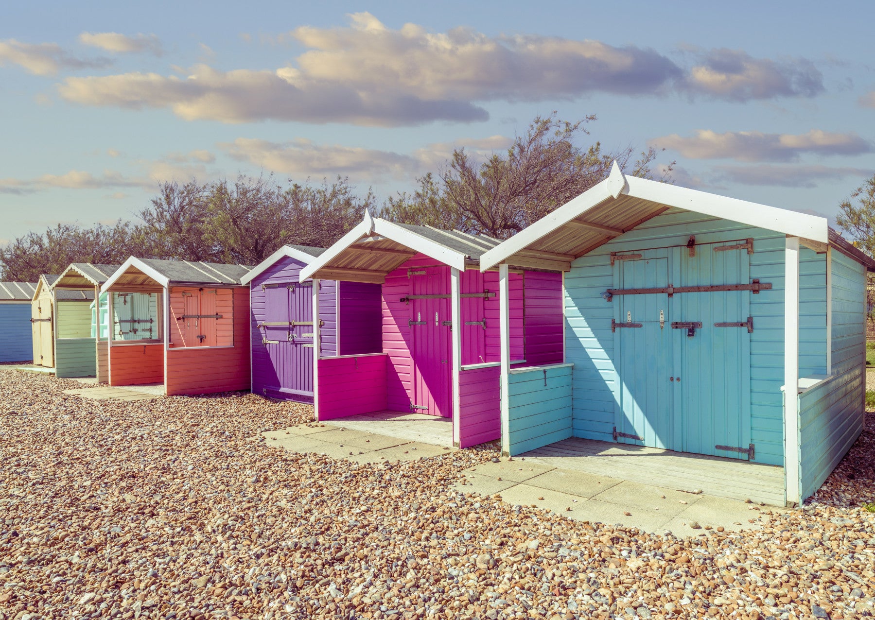 Unique beach Beach Row Bliss Wall Mural hut perspective.