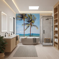 Bring the beach to your walls with this stunning vista. Imagine warm sands and gentle breezes within your living space! This captivating **wallpaper for walls** features towering palms against the backdrop of a peaceful ocean, transforming any room into a tranquil retreat. The calming colors—blues, greens, and browns—harmonize to establish a relaxing atmosphere, perfect for the bedroom or study. The wallpaper’s clean composition and natural beauty elevate the ambience of a room. Embrace this design to complement light-colored furnishings and natural textiles.