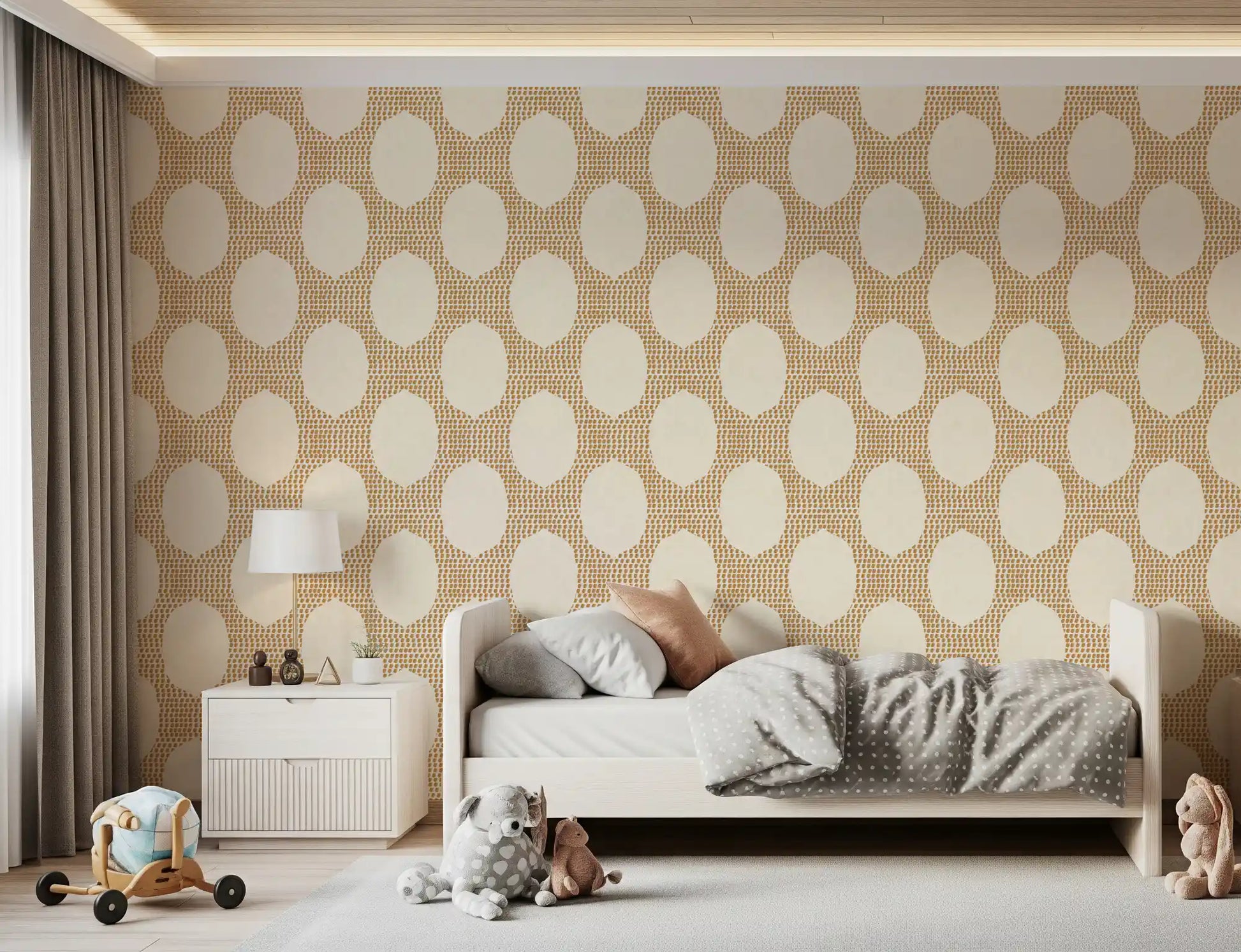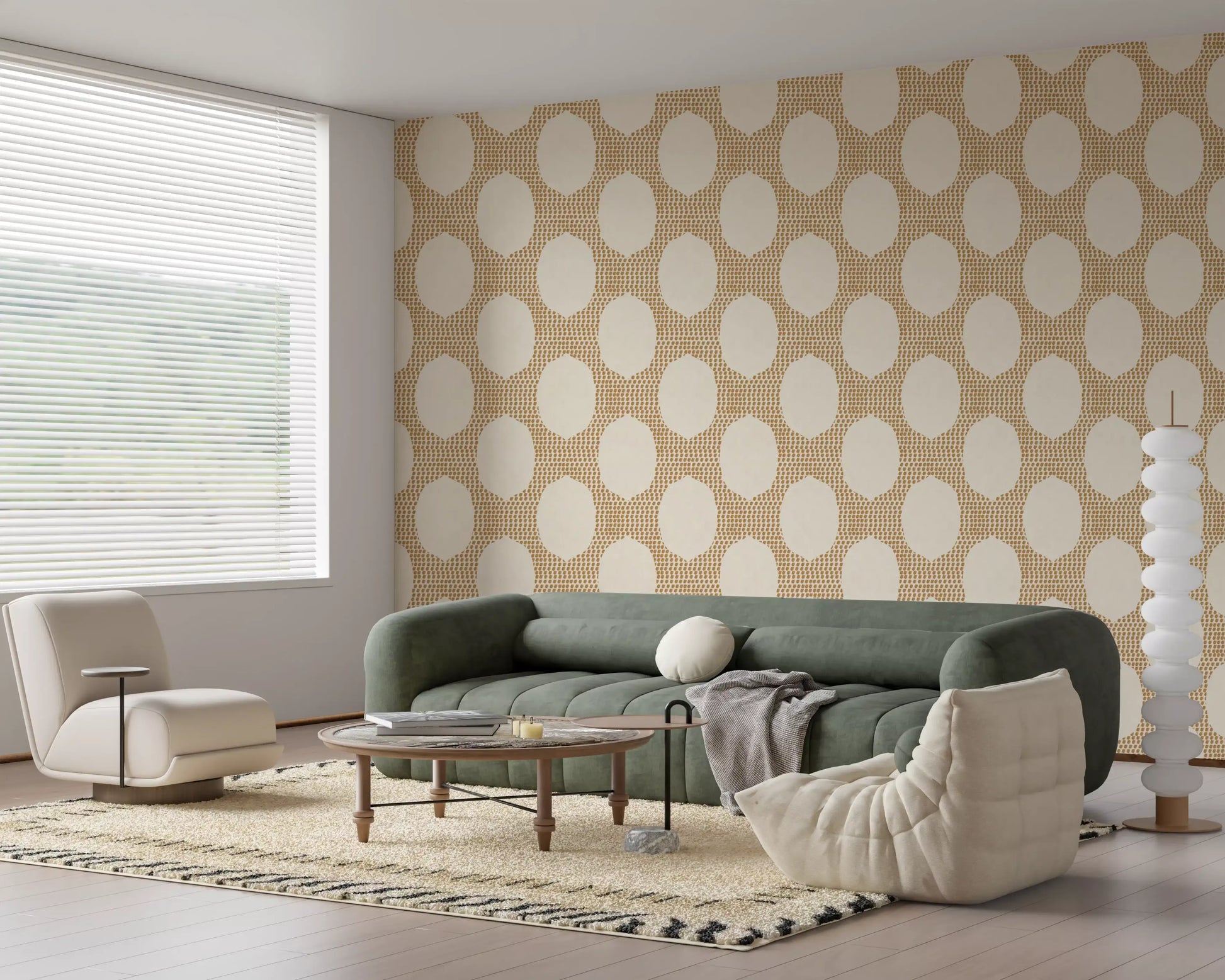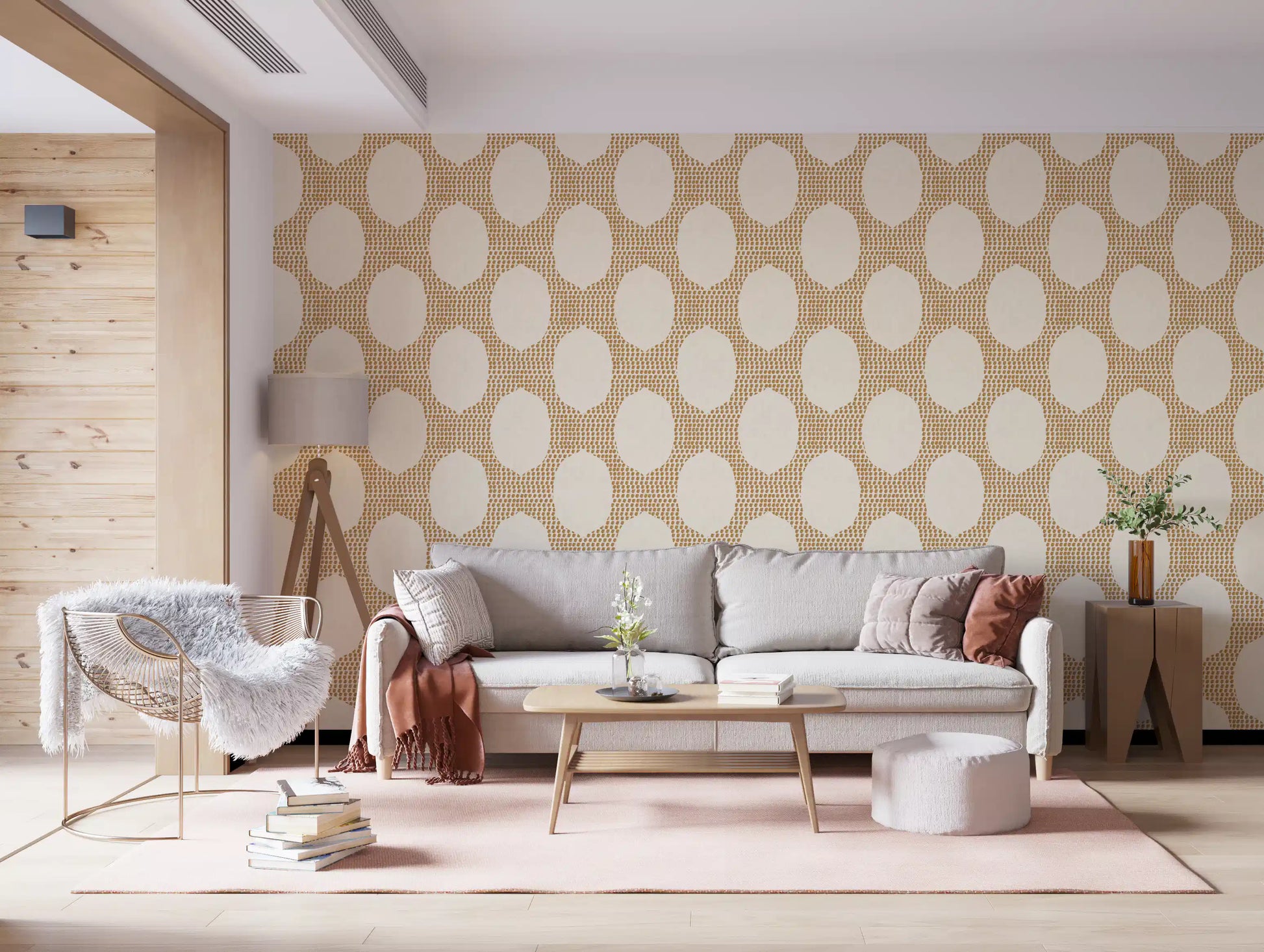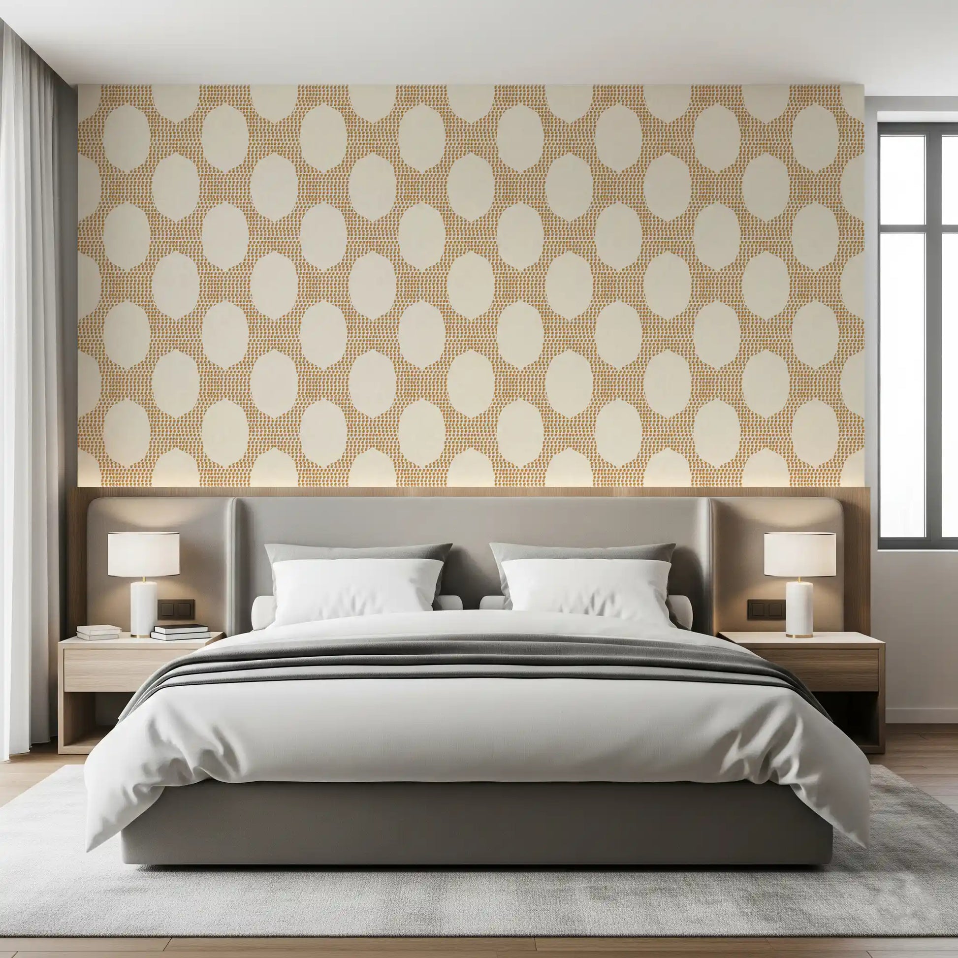 Transform your space into a serene escape with our "Beachy Boho Golden Mosaic" wall décor. This captivating pattern evokes the relaxed elegance of a coastal retreat fused with bohemian artistry. Delicate golden-brown brushstrokes are meticulously arranged to form an inviting mosaic, creating a rich, textured backdrop. Against this golden warmth, soft, creamy ovoid shapes emerge, offering a sense of calm and openness. The subtle woven texture woven throughout adds an organic, handcrafted feel, enhancing its natural charm. Perfect for creating a feature wall or enveloping an entire room, this design infuses any interior with a sun-kissed glow and an effortlessly chic ambiance. It’s a celebration of earthy tones and artistic expression, promising a tranquil haven that feels both sophisticated and wonderfully free-spirited. Embrace the relaxed luxury and warm embrace this unique pattern brings to your home.