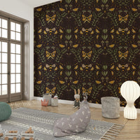 This wallpaper is a Bees Butterflies and Flowers Brown design, a unique repeating pattern with a soft, artistic style. It's a great wallpaper for walls for a child's room, bedroom, or any space that needs a charming feel. The design features hand-drawn butterflies, bees, and flowers in a mix of mustard yellow, brown, and green, set against a dark brown background. Made from high-quality, durable material, this wallpaper is a simple and quick way to refresh your home decor with a one-of-a-kind look.