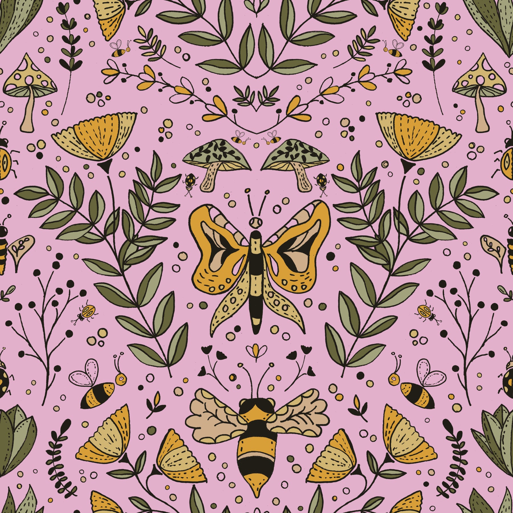 Design featuring hand-drawn insects and mushrooms on a pink background.