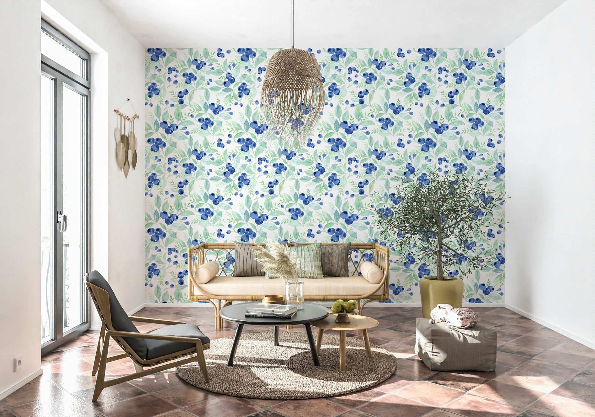Bring a touch of nature indoors with this delicate blueberry watercolor pattern by Uta Naumann. This design features lush green leaves and juicy blue berries, all painted with a soft watercolor style. Transform your space with this wallpaper for walls and watch how it enlivens any room. It makes a charming choice for kitchens, dining rooms, or nurseries. Let this refreshing wallpaper enhance your home with a simple, natural touch and brighten your space. The tranquil color palette complements a variety of interiors, making your space feel inviting and serene.