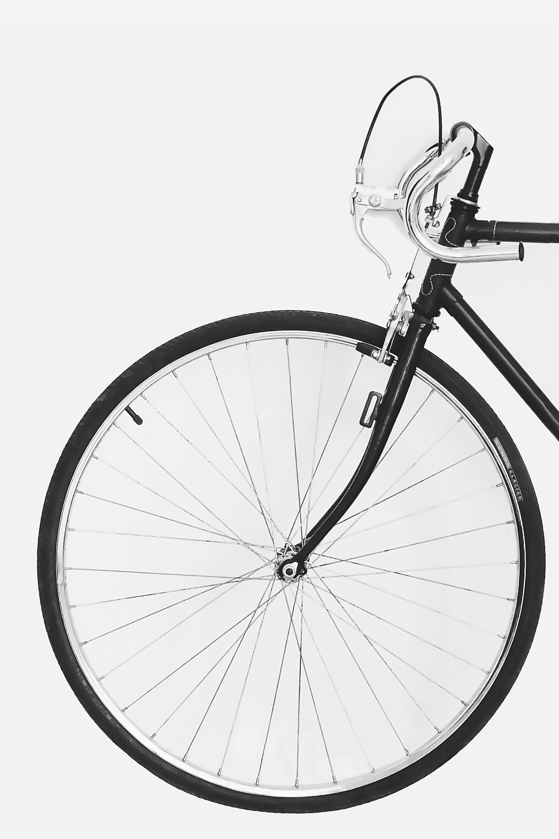 A minimalist monochrome close-up captures the elegant simplicity of a bicycle wheel and handlebars. The spokes radiate outwards from the hub, creating a captivating visual pattern against the stark white background. The sleek, black tire and polished silver handlebars contrast beautifully, highlighting the bicycle's refined design. This image evokes a sense of timeless style and effortless movement, perfect for those who appreciate clean aesthetics and understated sophistication. The detail and focus on the wheel invite contemplation of journeys yet to be taken. A perfect choice for a calming and stylish desktop or mobile wallpaper.