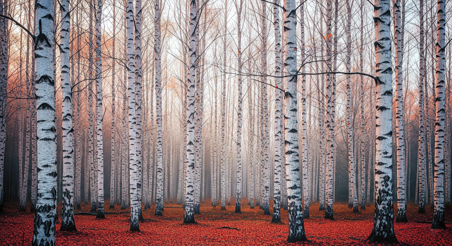 Transform your living space with this serene forest scene. Tall birch trees stand in stark contrast to a ground covered in fallen leaves. This pattern adds depth and a natural touch to any room. The interplay of white, black, and red offers a calming, yet dramatic effect. This wallpaper for walls suits living rooms, bedrooms, or hallways, creating a refreshing connection to nature. Enhance your interior style with this tranquil design.