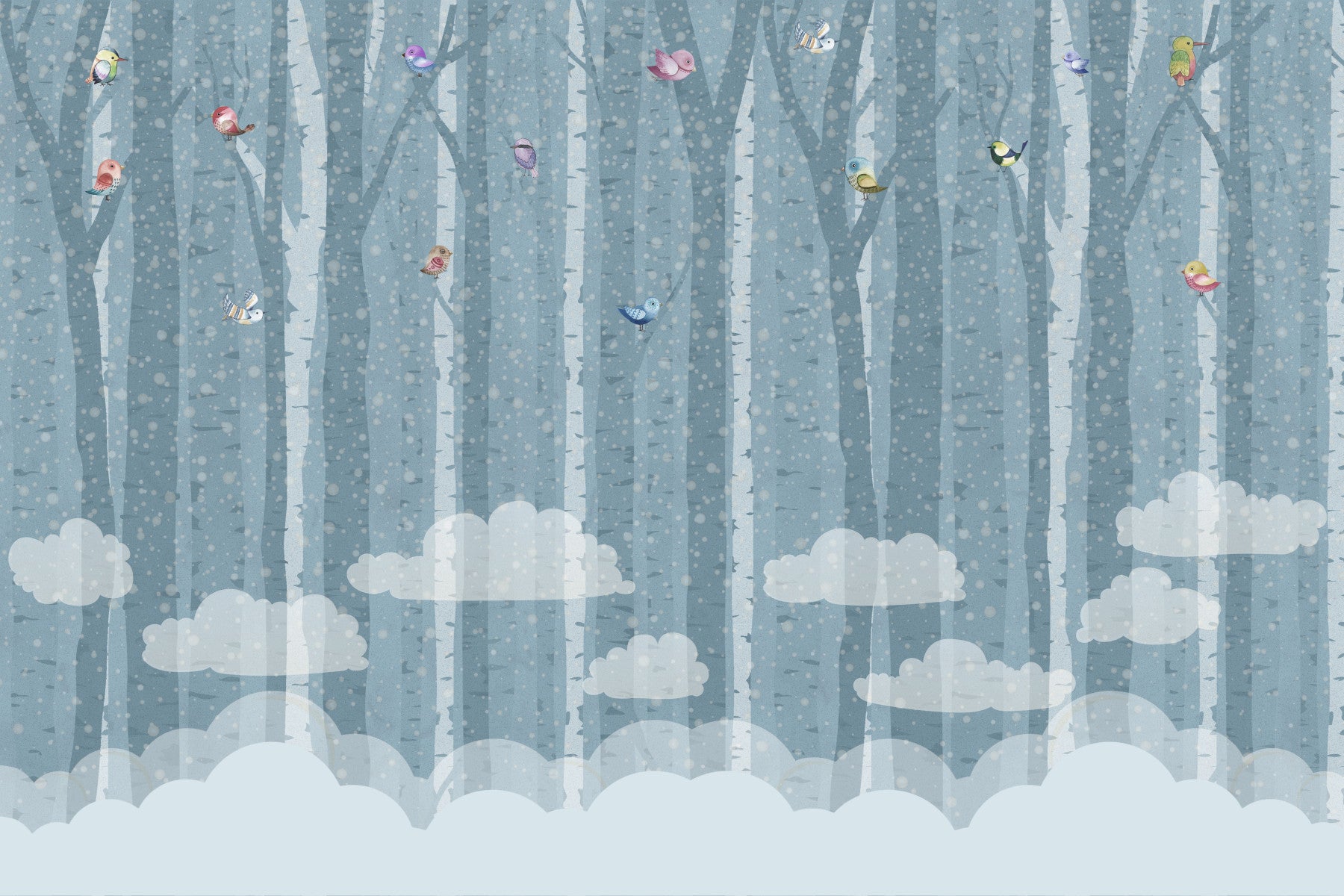 Bring the peace of a winter forest to your home with this wallpaper for walls. Light blue birch trees create a calming backdrop, while colorful birds add a touch of whimsy. The soft clouds at the bottom ground the design, creating a serene atmosphere. It's perfect for a nursery, bedroom, or any space where you want to inspire relaxation. This wallpaper complements interiors with a sweet and gentle mood.