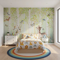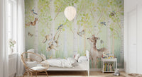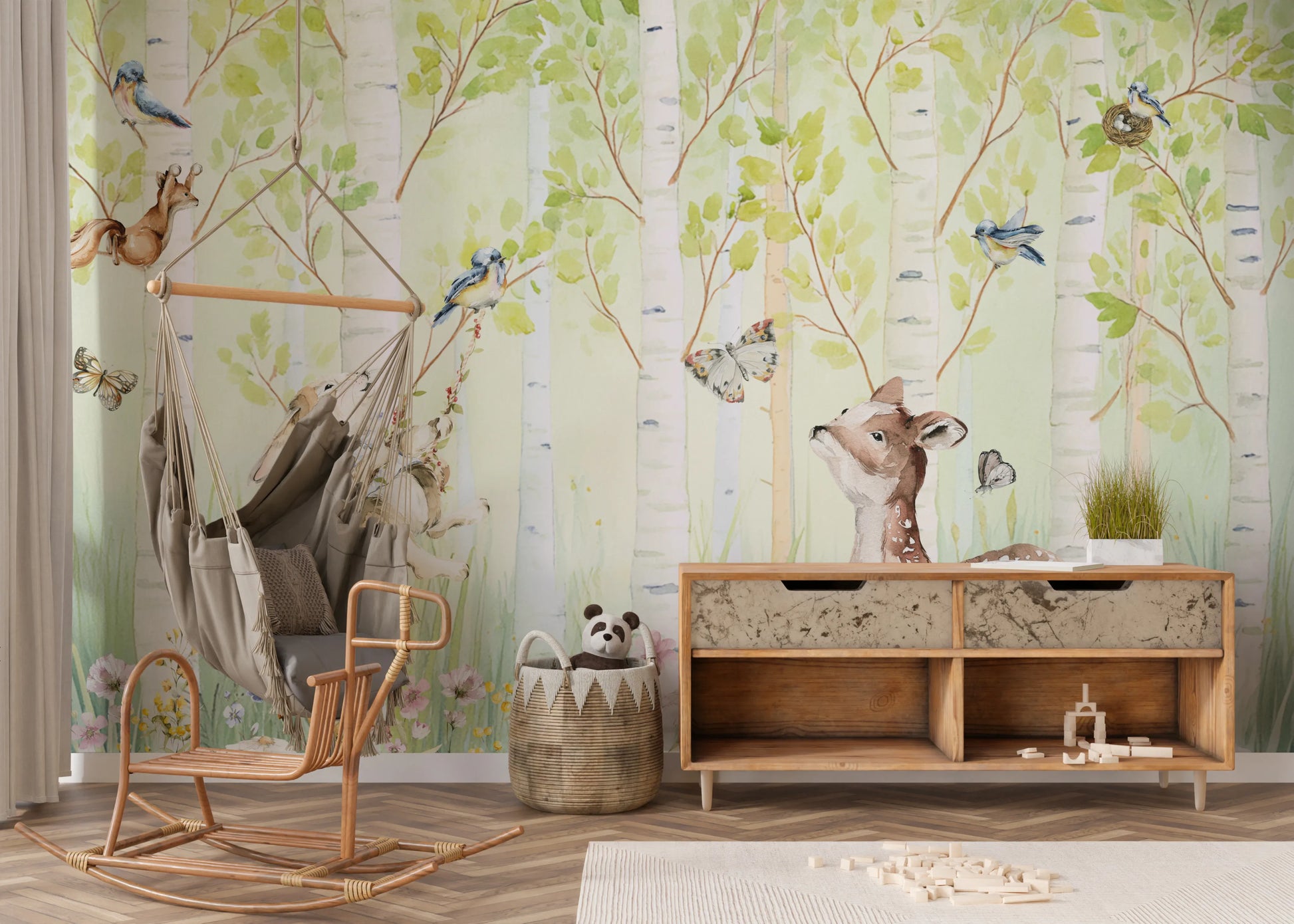 Invite a peaceful woodland scene into your home with this nature-inspired wallpaper for walls. The design displays a tranquil birch forest, inhabited by adorable animals like a bunny on a swing and a curious fawn. Watercolor techniques create a soft, dreamy quality, enhanced by a pastel color palette. Perfect for bringing a sense of calm to a bedroom, playroom, or nursery. This wallpaper makes a wonderful accent, creating a serene and imaginative environment. See how it enlivens your space with quiet charm.