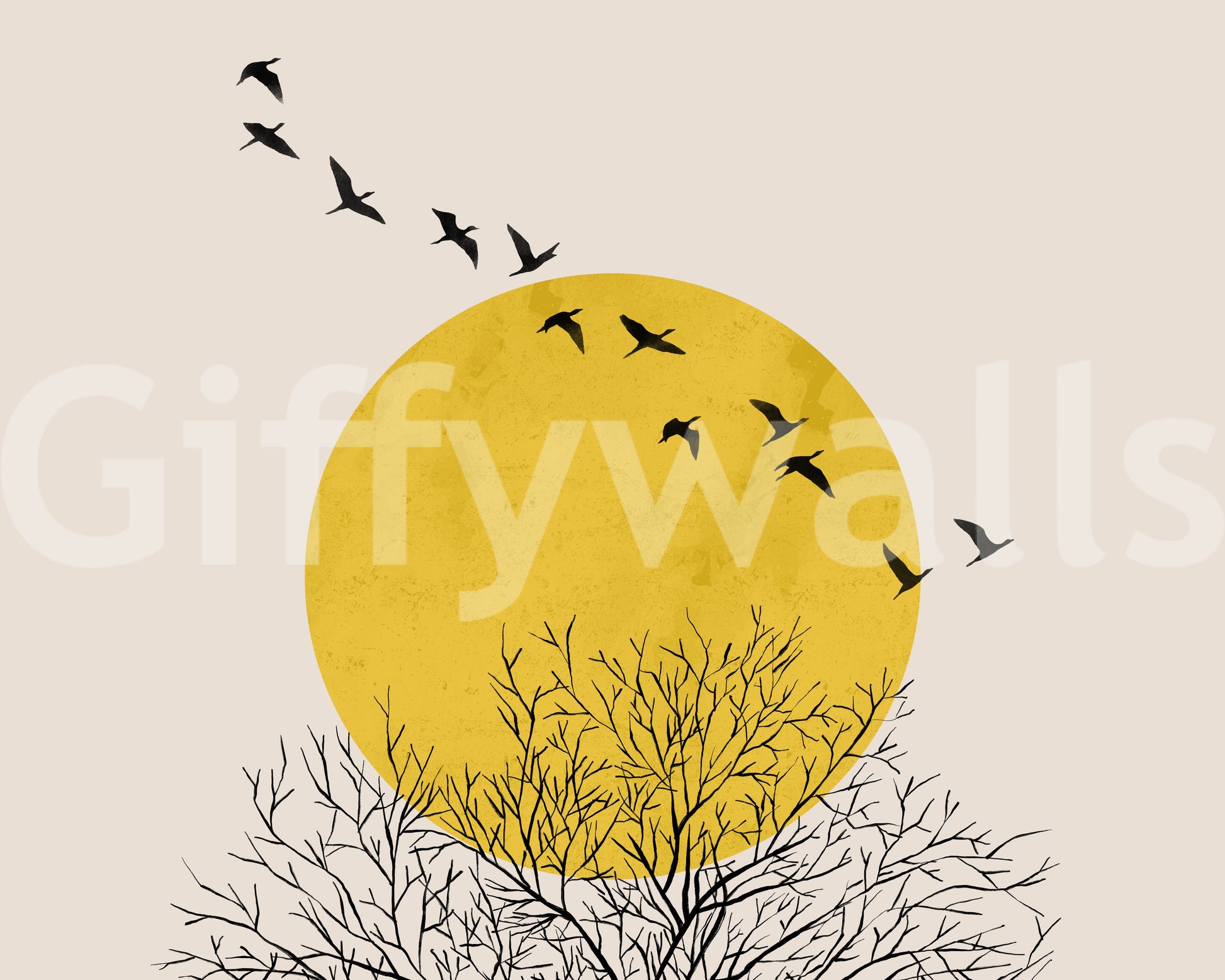 Embrace the tranquility of dawn with "Birds at Sunrise," a minimalist piece that brings the serene beauty of nature into your home. This captivating artwork features a striking, textured golden sun rising behind a cluster of delicate, bare branches. A flock of birds, silhouetted against the luminous sky, embarks on their morning journey, symbolizing hope and new beginnings. The gentle, muted tones create a sense of calm and peace, making it an ideal addition to any room seeking a touch of natural elegance. Let this scene transform your walls into a vista of quiet beauty, inviting a sense of peaceful contemplation into your living space. Ideal for creating a focal point that embodies both simplicity and sophistication. Enhance your environment with the understated charm of the awakening world.