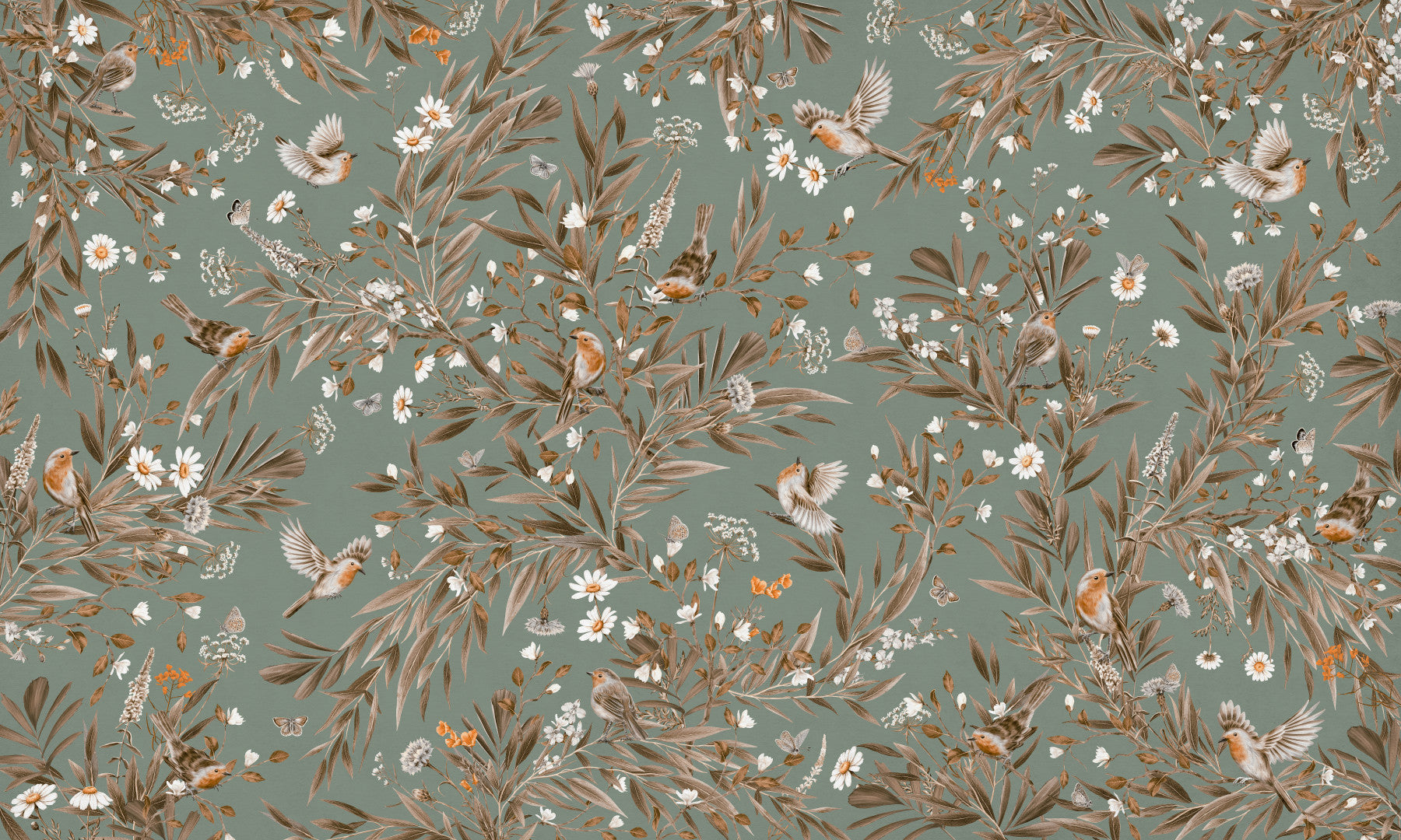 Romantic floral and fauna print on the Birds & Blooms Symphony Wall Mural.