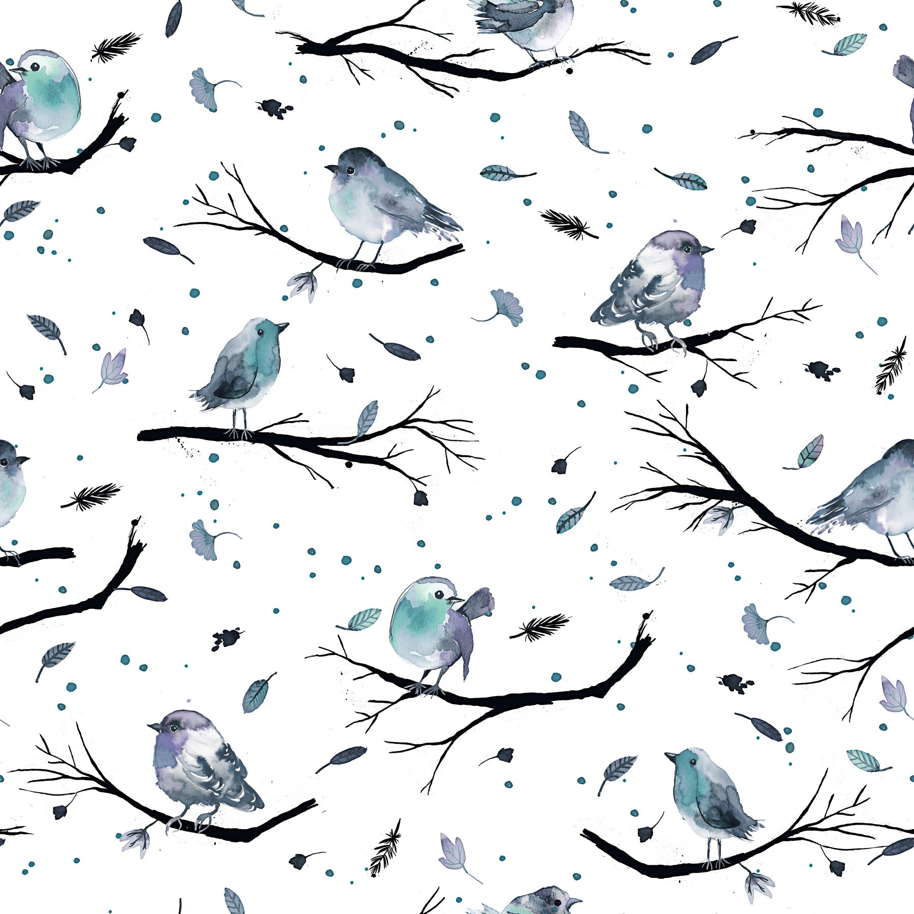 A serene watercolor wallpaper featuring charming robins perched on delicate, bare branches. The birds are rendered in soft aqua blues and muted purples, creating a calming and ethereal atmosphere. Scattered leaves and subtle teal accents add a touch of whimsy against the crisp white background. This design evokes a sense of peaceful winter tranquility, perfect for adding a touch of nature's elegance to any digital device. The simple yet elegant aesthetic makes it a versatile choice for various styles and preferences. Enjoy the subtle beauty of these birds finding solace amidst the winter branches.