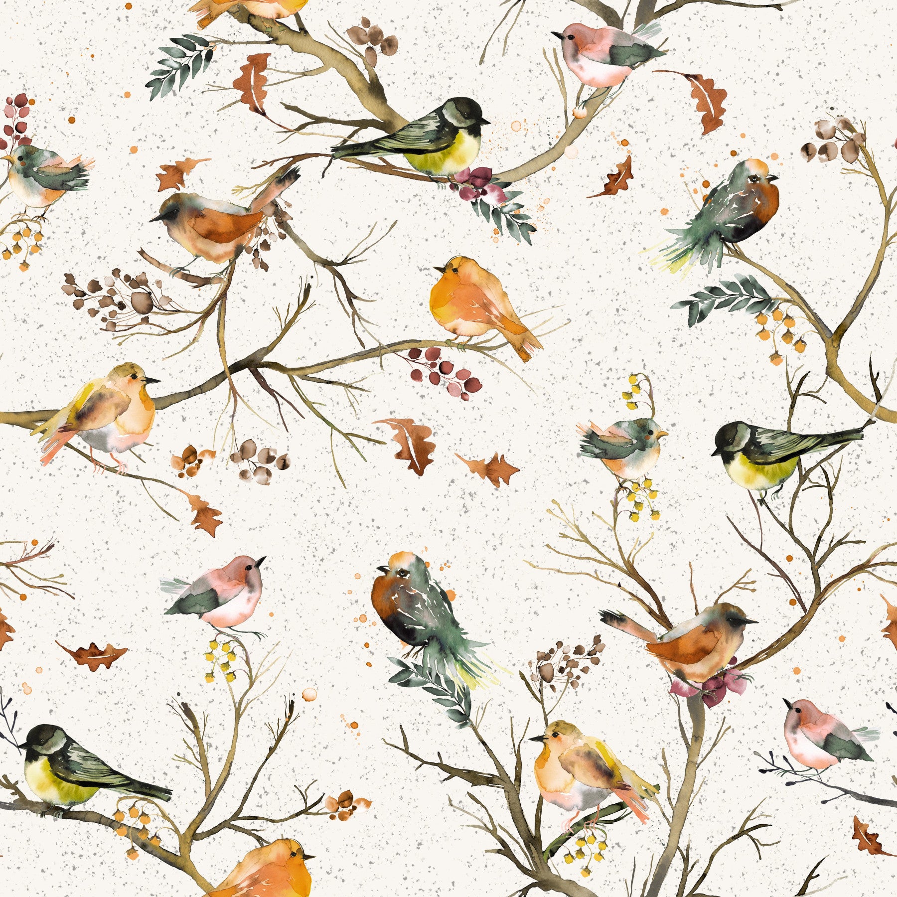 Embrace the serene beauty of a rustic garden with this watercolor wallpaper. Delicate birds in warm autumnal hues perch on gnarled, leaf-strewn branches, creating a charming and peaceful scene. Soft greens, oranges, and browns blend seamlessly against a textured off-white background, evoking a sense of tranquility and natural charm. The whimsical watercolour style adds a touch of elegance to this idyllic garden setting, perfect for bringing a touch of nature's tranquility to any digital space. This wallpaper perfectly captures the essence of a quiet, autumnal garden where birdsong fills the air and nature's artistry unfolds.