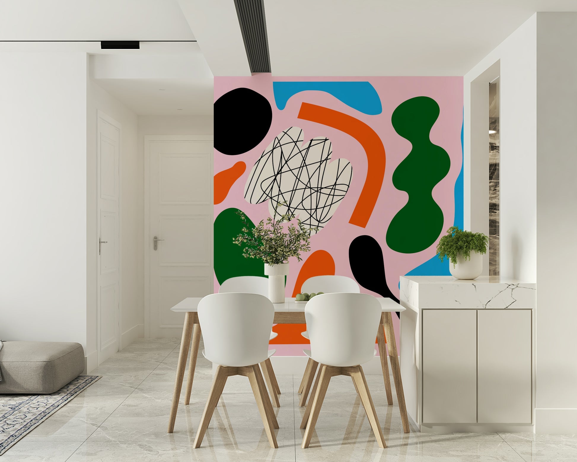 Step into a realm of playful sophistication with 'Birth of Cool', a wallpaper that embodies modern simplicity with a twist. Against a soft pastel pink backdrop, bold and organic shapes in striking hues of orange, green, blue, and black dance in a harmonious composition. The playful yet deliberate arrangement evokes a sense of lightheartedness and contemporary style. A central scribble design adds an element of controlled chaos, injecting energy and intrigue into the minimalist aesthetic. This wallpaper is perfect for those who appreciate clean lines, bold color palettes, and a touch of unconventional flair. Transform your space into a gallery of modern art with 'Birth of Cool', a design that invites creativity and inspires a fresh perspective.