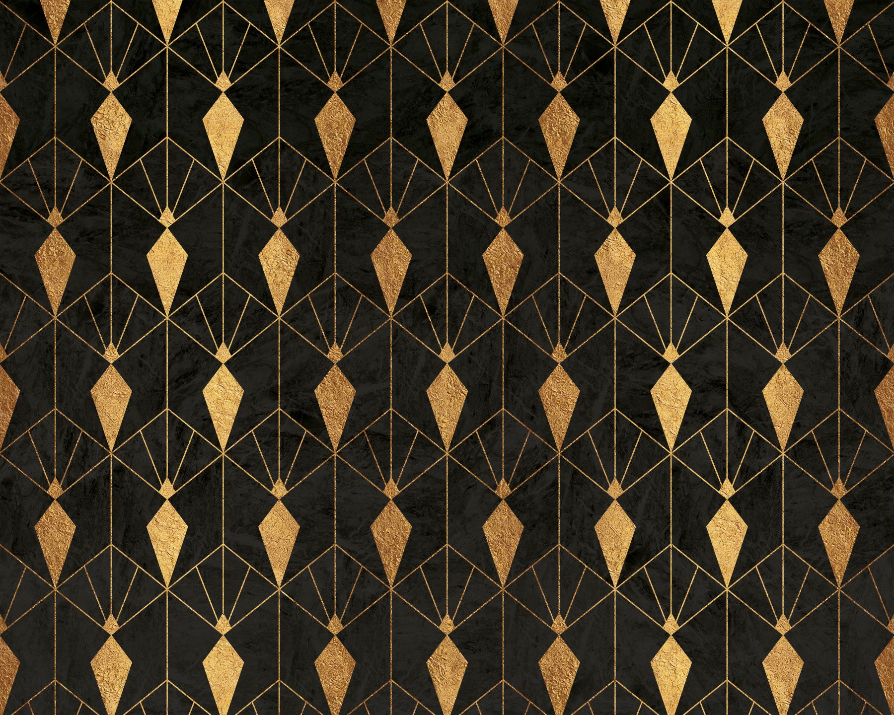 Step into a world of opulent glamour with Black Art Deco Night. This wallpaper evokes the lavish parties and sophisticated design of the Roaring Twenties, reimagined with a contemporary edge. A rich, textured black backdrop serves as the canvas for a dazzling display of geometric Art Deco motifs rendered in shimmering gold. The intricate linework creates a captivating rhythm, while the use of metallic gold adds a touch of luxury and depth. The contrast between the dark background and the radiant gold generates a sense of drama and intrigue, reminiscent of a star-studded night sky. Perfect for creating a statement wall or adding a touch of vintage elegance to any room, 'Black Art Deco Night' is a timeless design that will transform your space into a haven of style and sophistication.