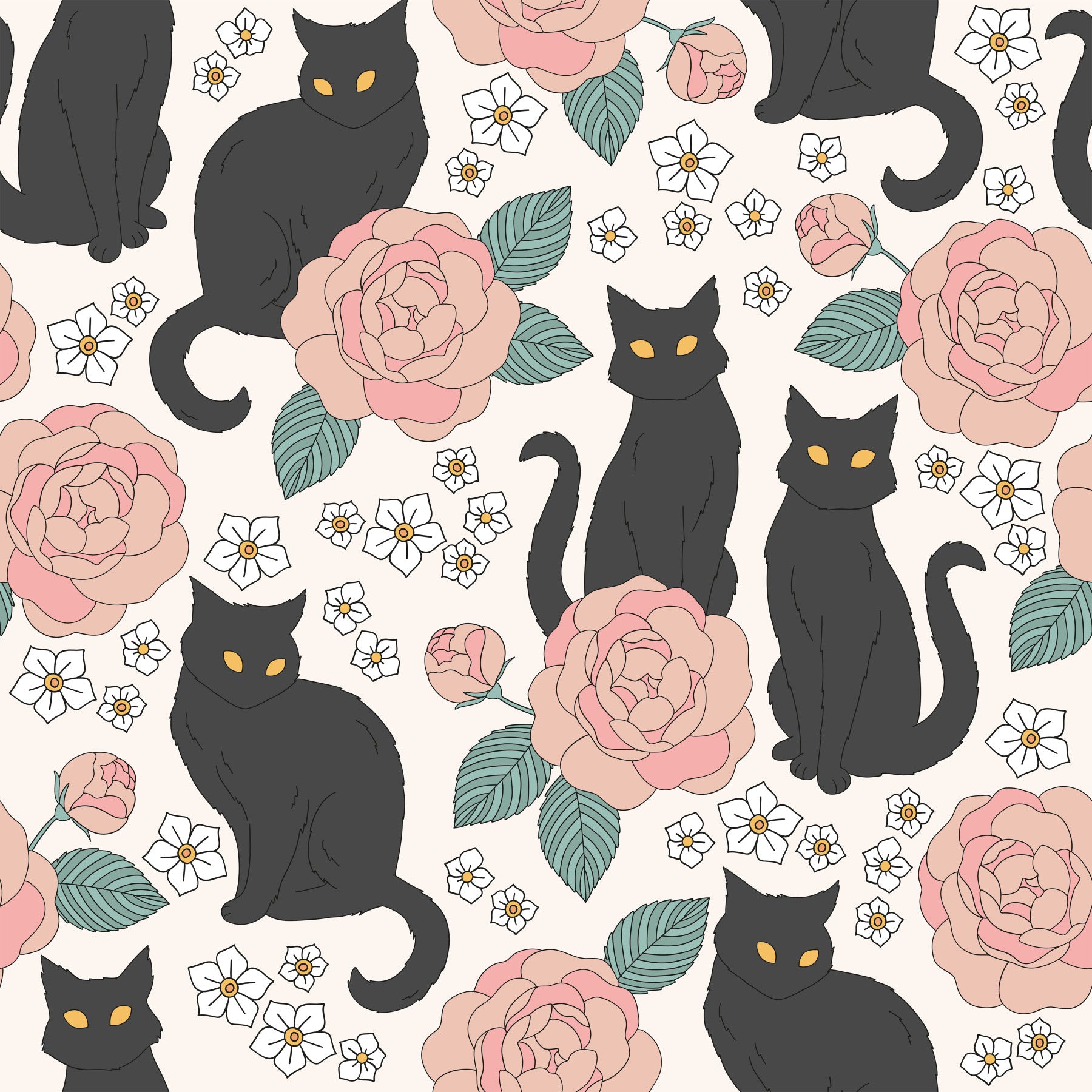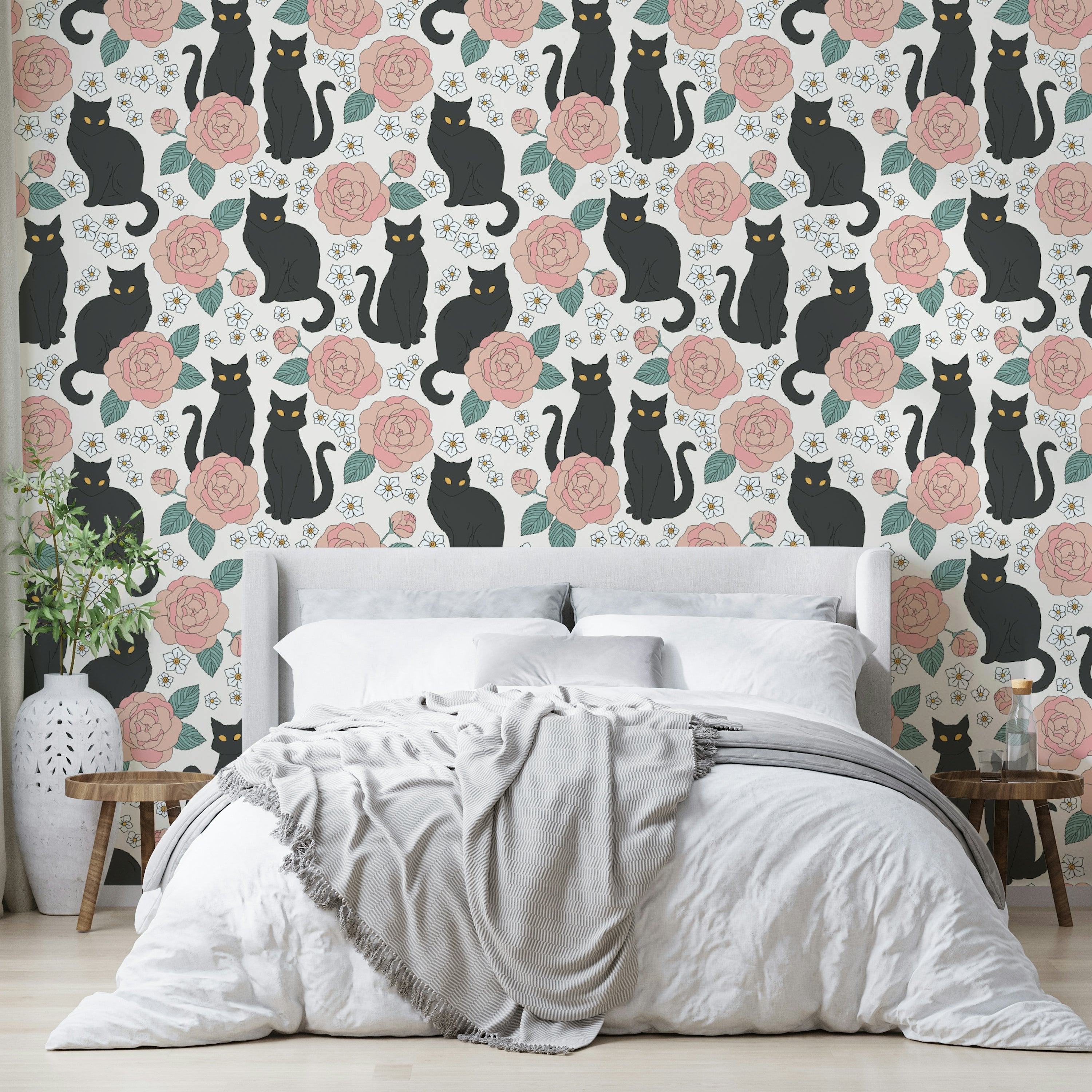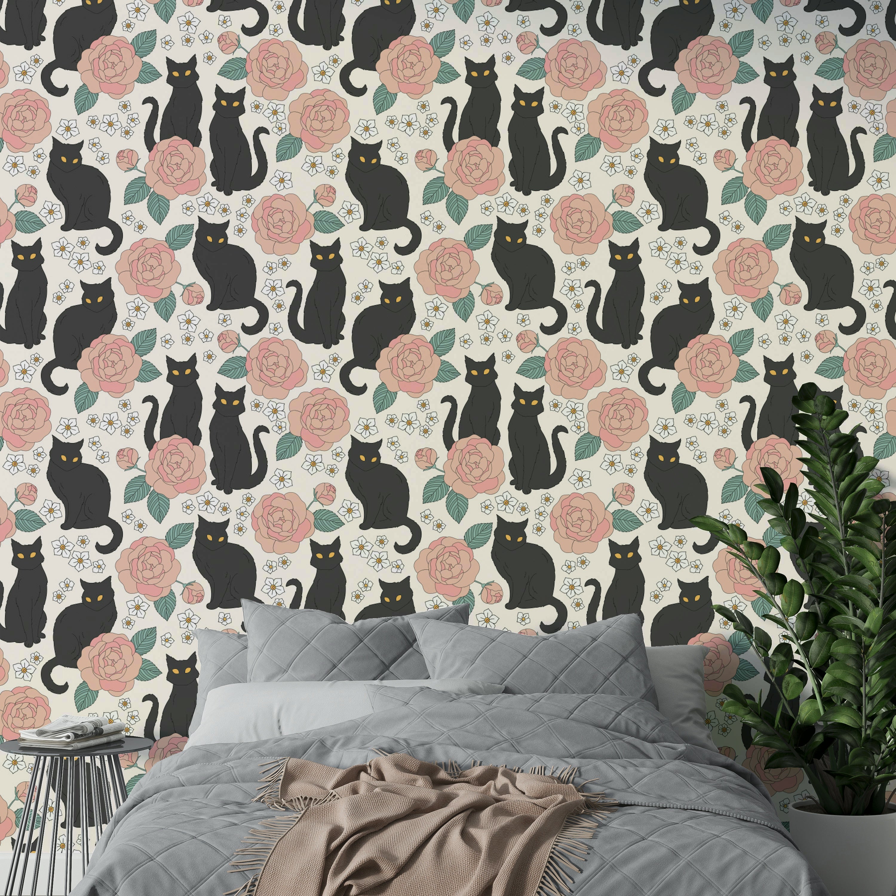 Add a dash of magic to your decor with this captivating black cat and floral wallpaper for walls. The design pairs striking black cats with blush pink roses and delicate white blossoms, creating a delightful contrast against a light beige backdrop. Teal leaves inject a subtle splash of color, enhancing the wallpaper's overall appeal. This pattern breathes life into living spaces, bedrooms, or hallways. Its playful yet stylish design guarantees to complement any interior.