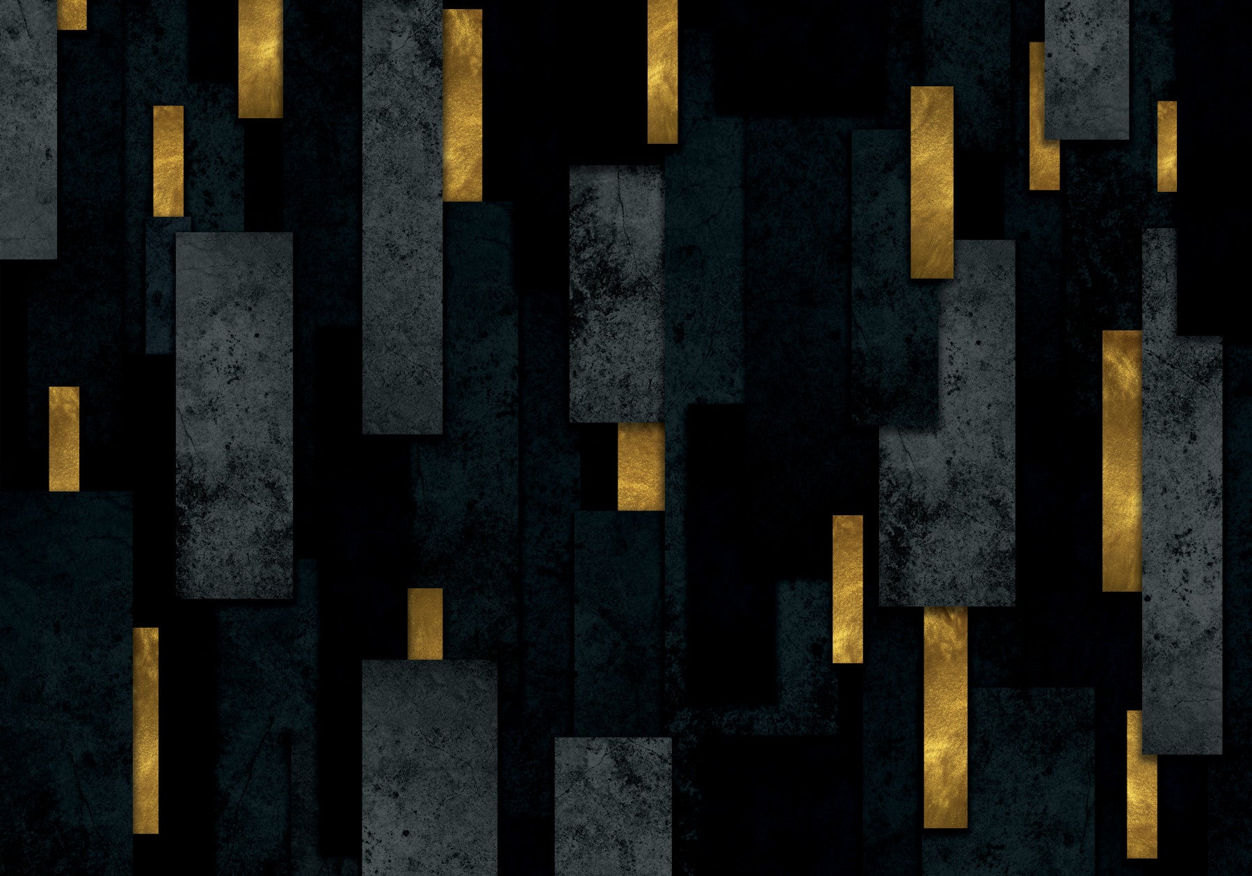 Immerse yourself in the captivating 'Black Urban Charcoal Spires' wallpaper. This abstract design features a dramatic interplay of dark charcoal and golden rectangles, reminiscent of golden rain in a night sky. The textured background evokes a sense of gritty urbanity, while the elegant gold elements add a touch of luxury and sophistication. The overall effect is both modern and moody, creating a sophisticated and visually arresting backdrop. Perfect for those who appreciate a bold, contemporary aesthetic with a hint of opulence.