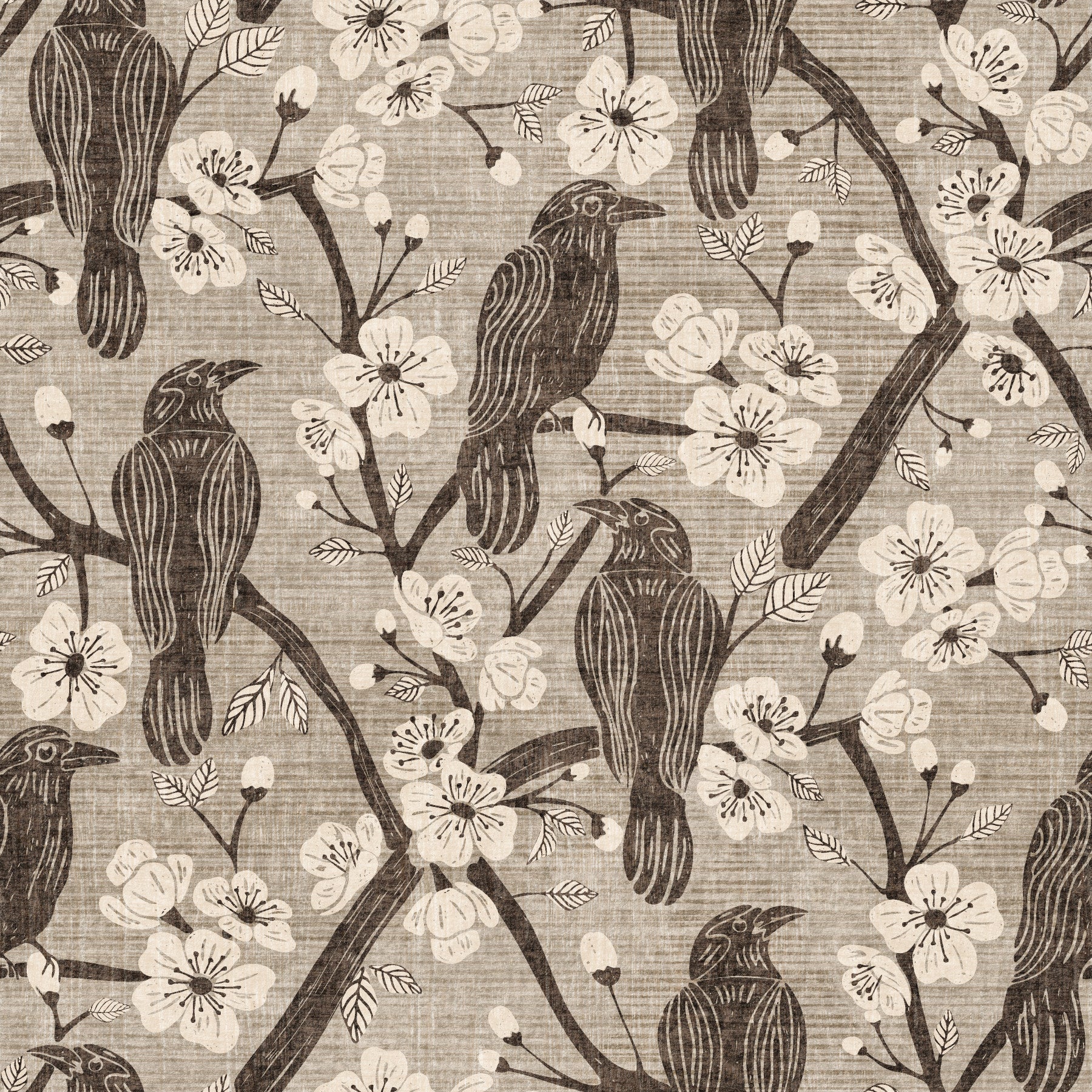 Infuse your space with natural charm using this sophisticated wallpaper design. Dark crows blend with blossoming branches against a background with a delicate, woven texture. The beige and charcoal color palette creates a calming, elegant look. Use this wallpaper for walls in bedrooms and living spaces to give an artistic touch. Perfect for accent walls, this wallpaper elevates any interior. The pattern beautifully complements both modern and vintage furniture styles.