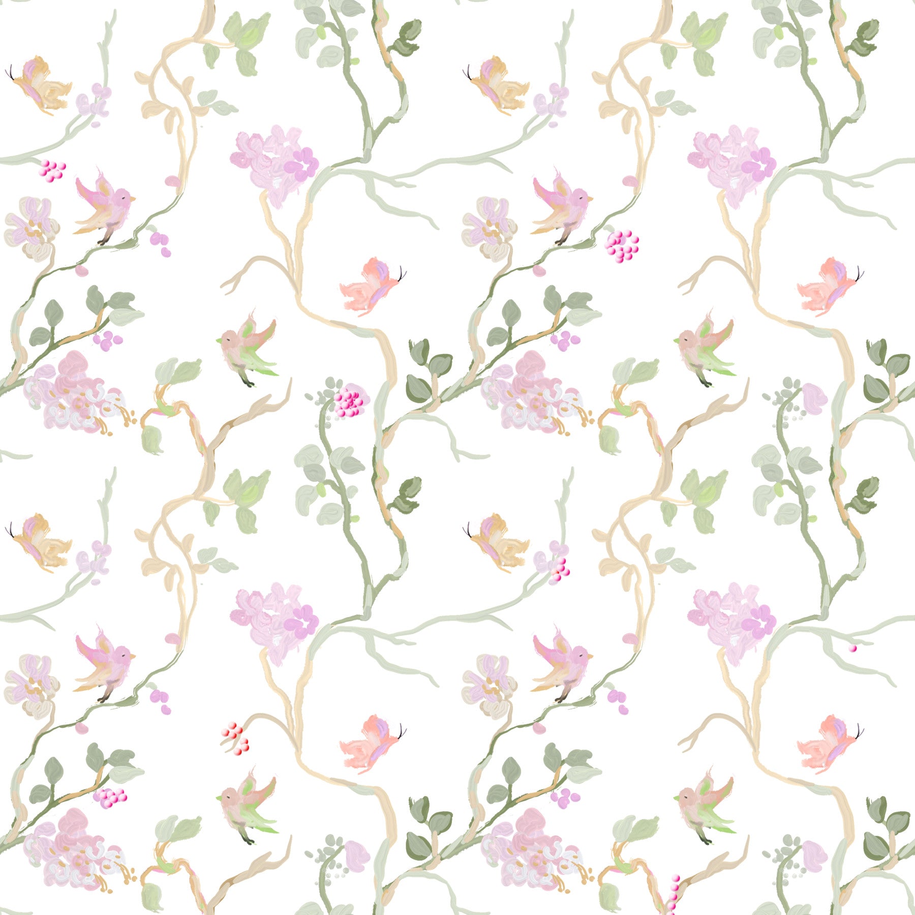 Feminine nursery Blossom & Flight Wallpaper room backdrop.